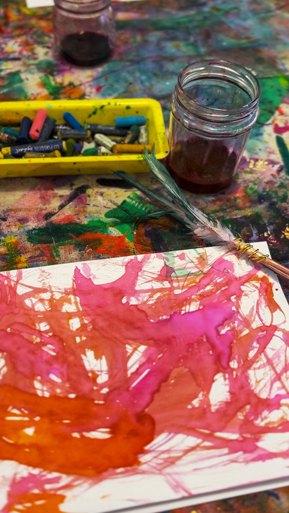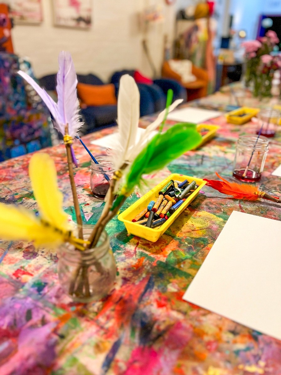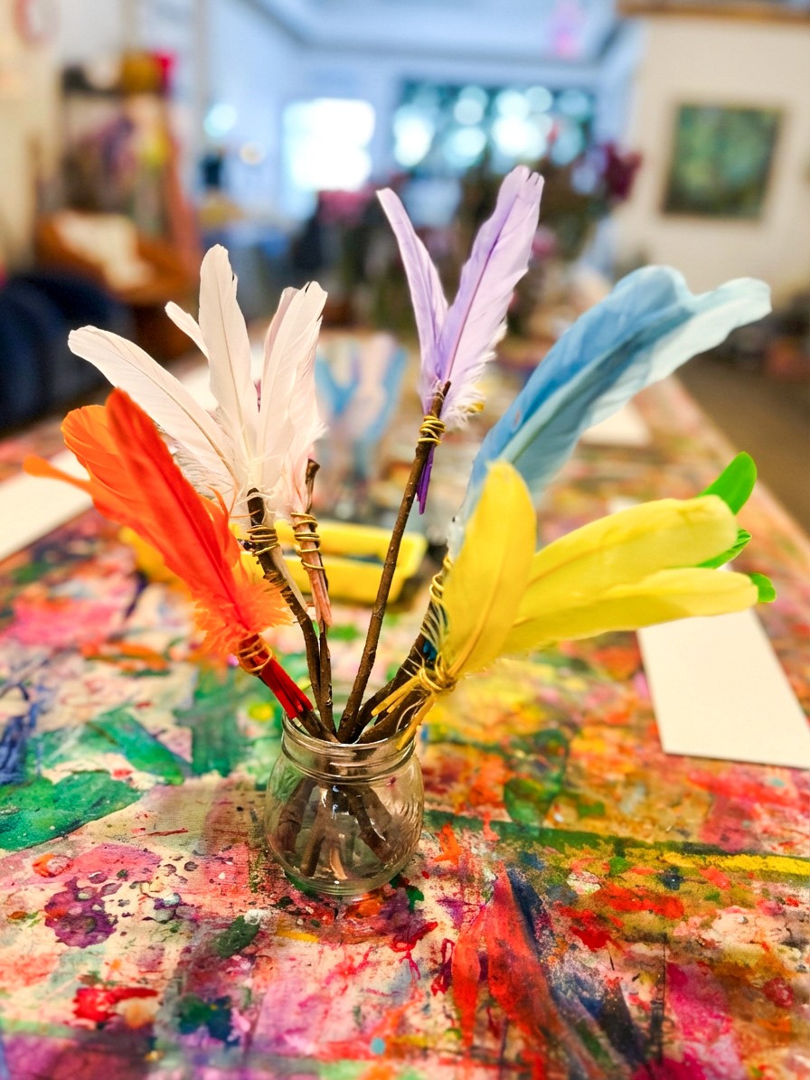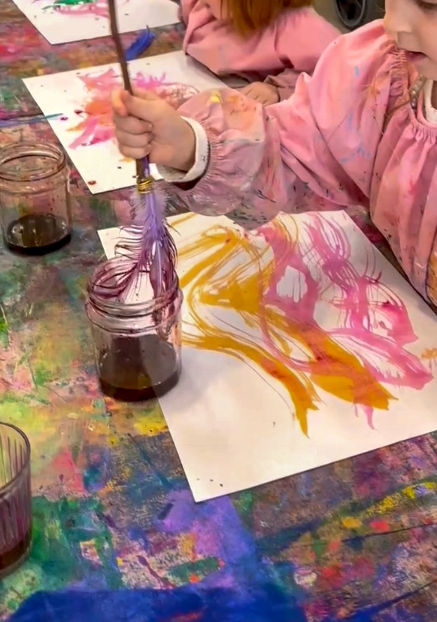 Let artists start by making their brushes, wrapping feathers onto sticks with wire, experimenting with different feather sizes and arrangements. It's fun to see the variety of brushes that come out of this... some carefully constructed, others wild and full. Once the brushes are ready, it's time to paint. The marks feather brushes make are gorgeous: light, wispy strokes that look completely different from anything a regular brush can do. Encourage artists to try sweeping motions, dabbing, dragging, and twirling. Layering liquid watercolour with oil pastel resist creates beautiful effects too.