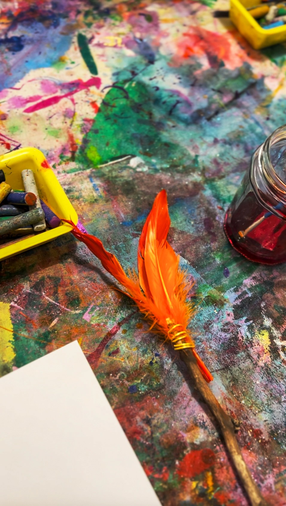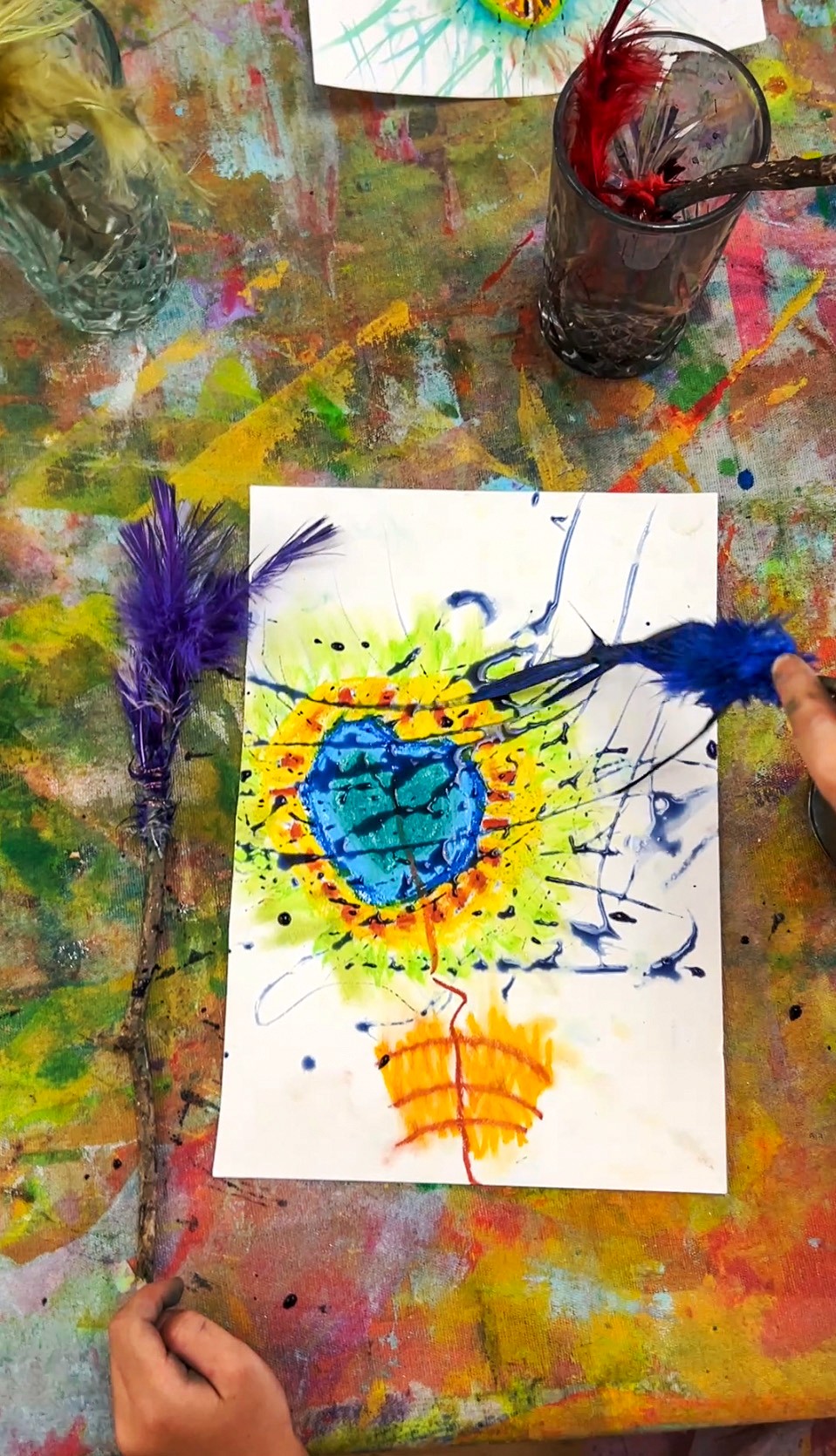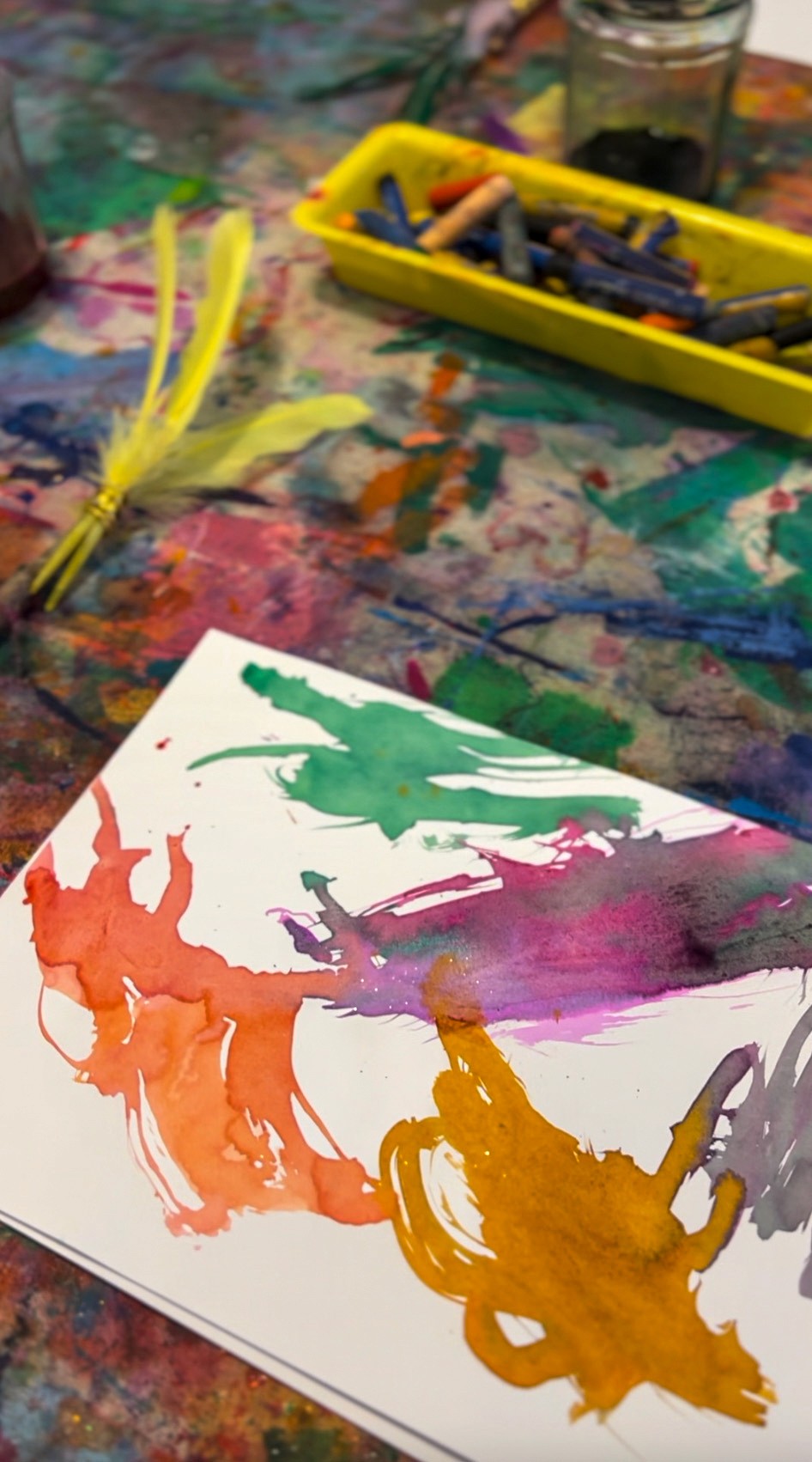 Let artists start by making their brushes, wrapping feathers onto sticks with wire, experimenting with different feather sizes and arrangements. It's fun to see the variety of brushes that come out of this... some carefully constructed, others wild and full. Once the brushes are ready, it's time to paint. The marks feather brushes make are gorgeous: light, wispy strokes that look completely different from anything a regular brush can do. Encourage artists to try sweeping motions, dabbing, dragging, and twirling. Layering liquid watercolour with oil pastel resist creates beautiful effects too.