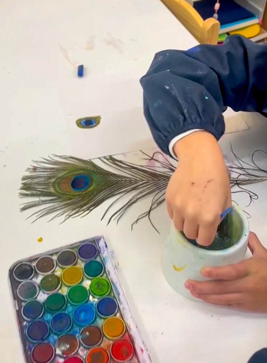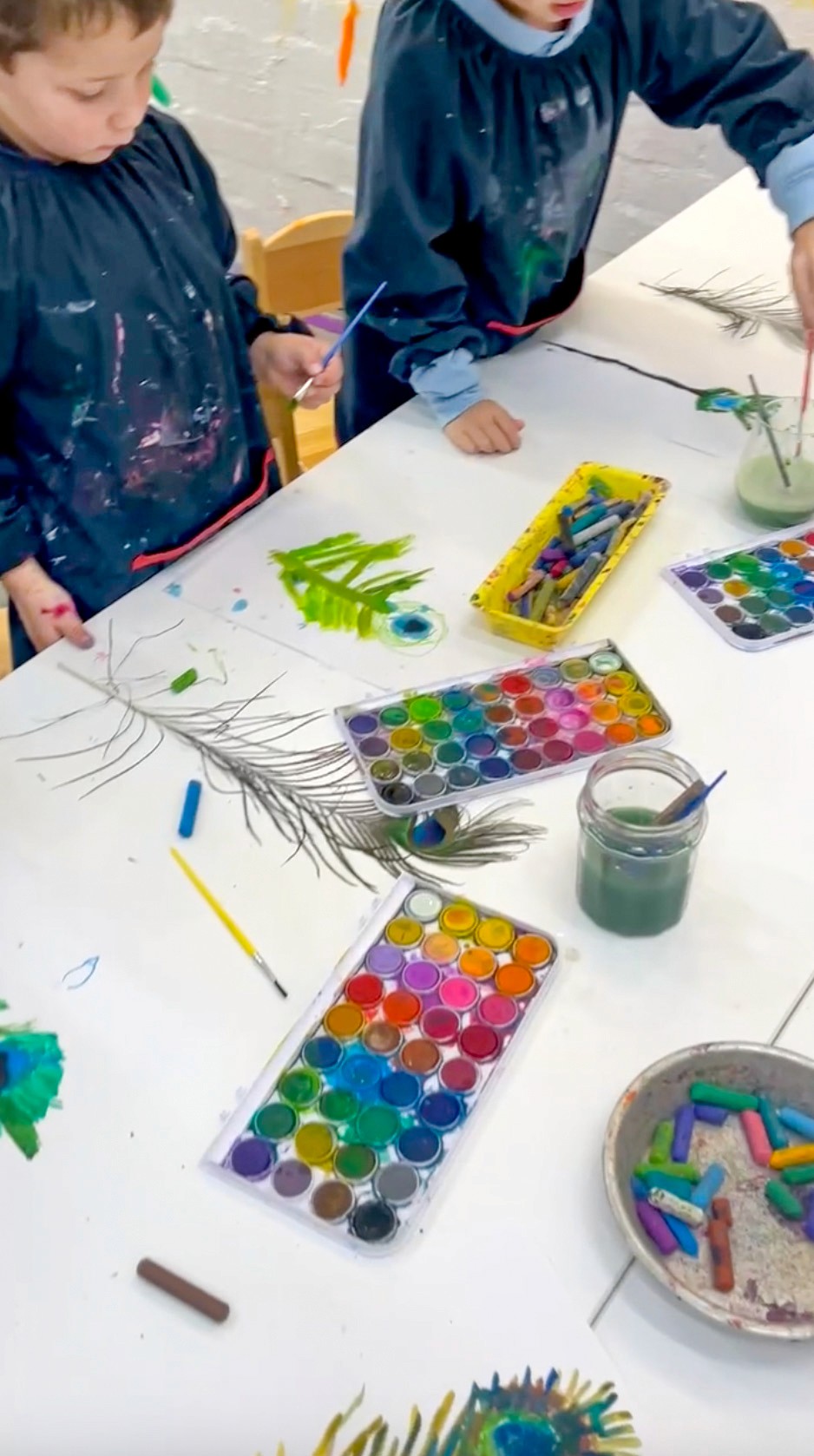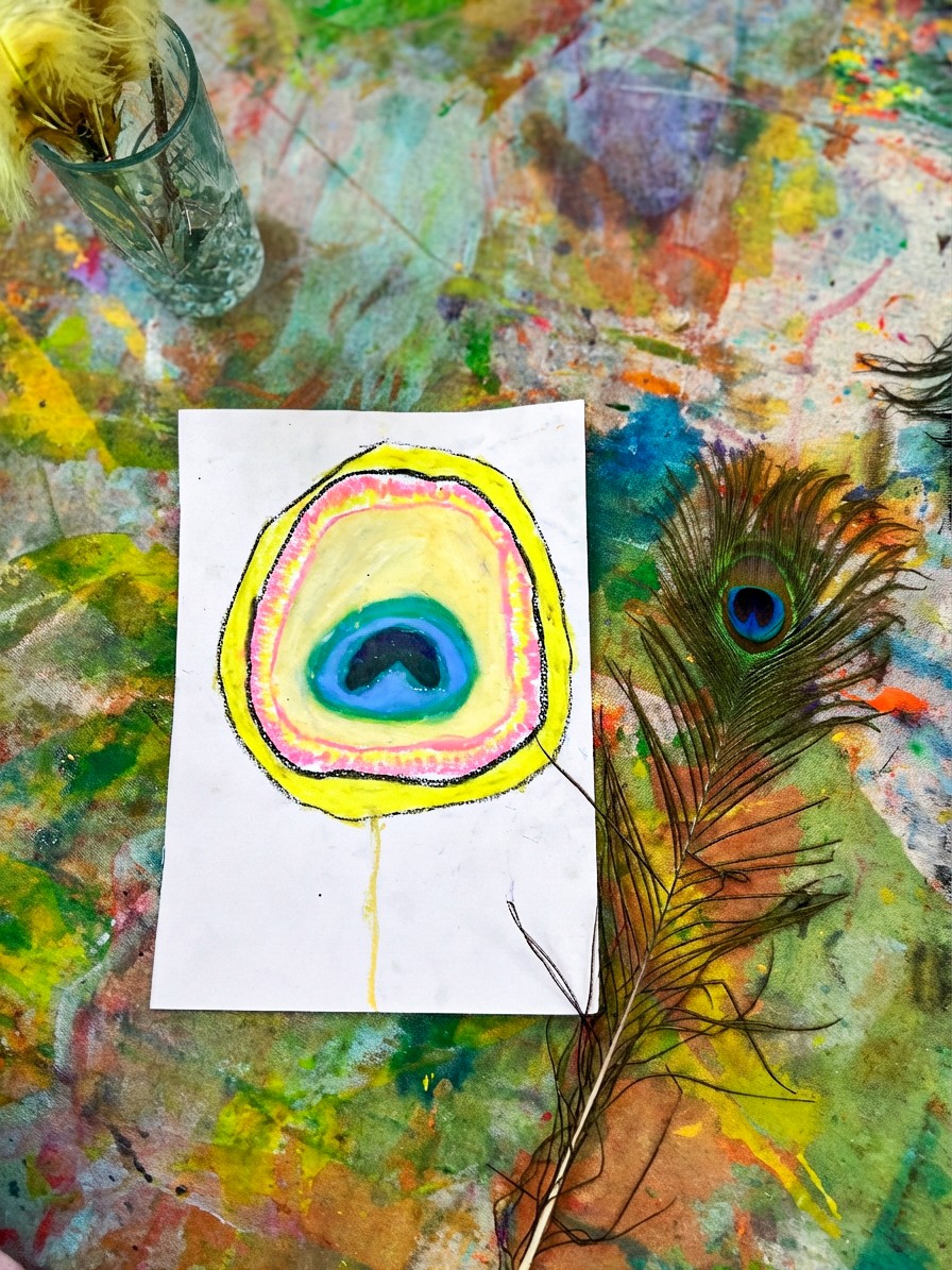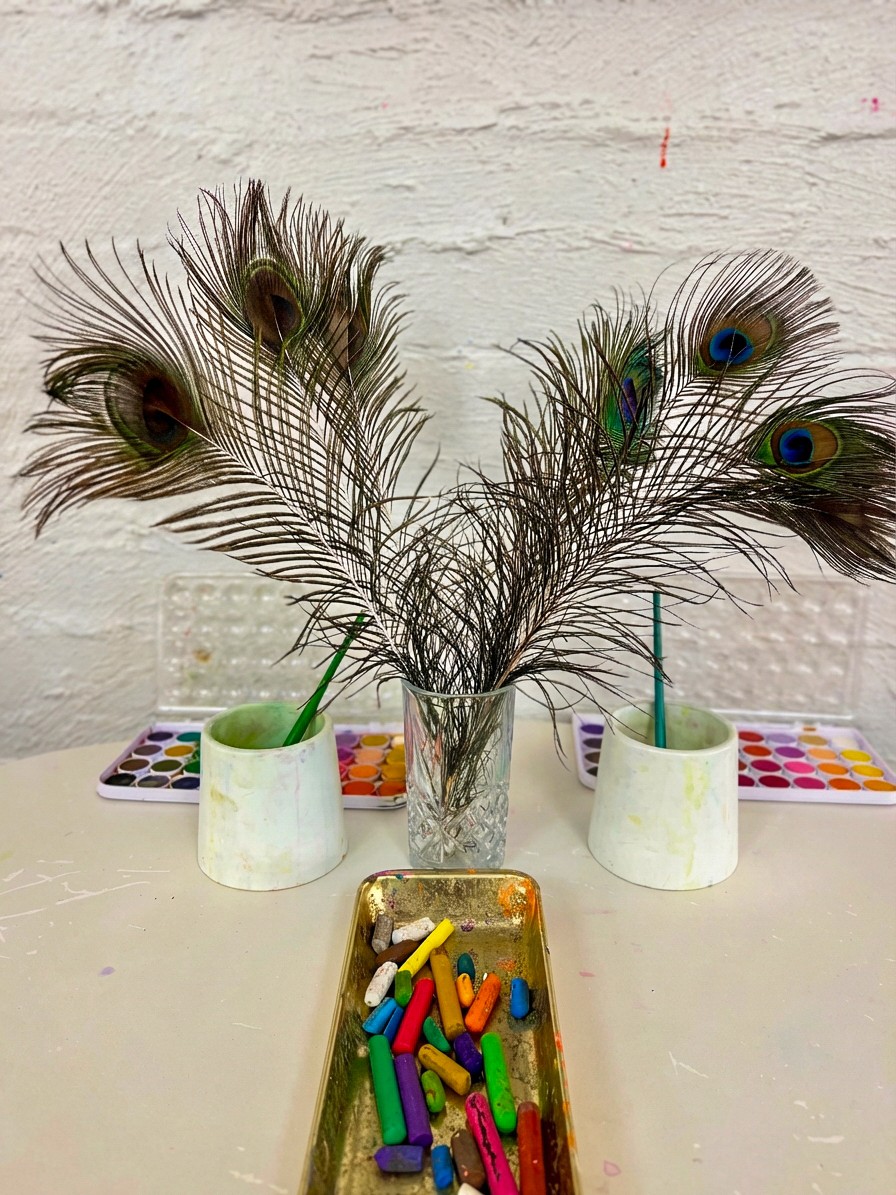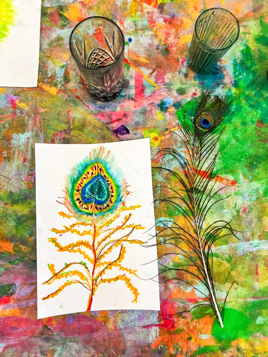 Place feathers in the centre of the table, a mix of peacock feathers and other interesting feathers if you have them. Set out oil pastels in curated colours (greens, blues, teals, golds) alongside watercolour palettes. We love offering long, thin paper for this activity to mimic the shape of the feathers themselves.