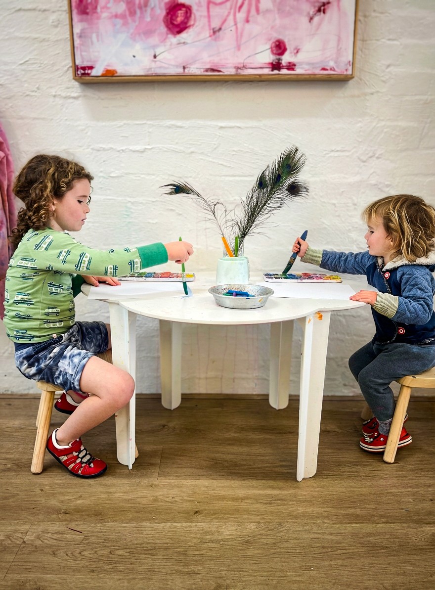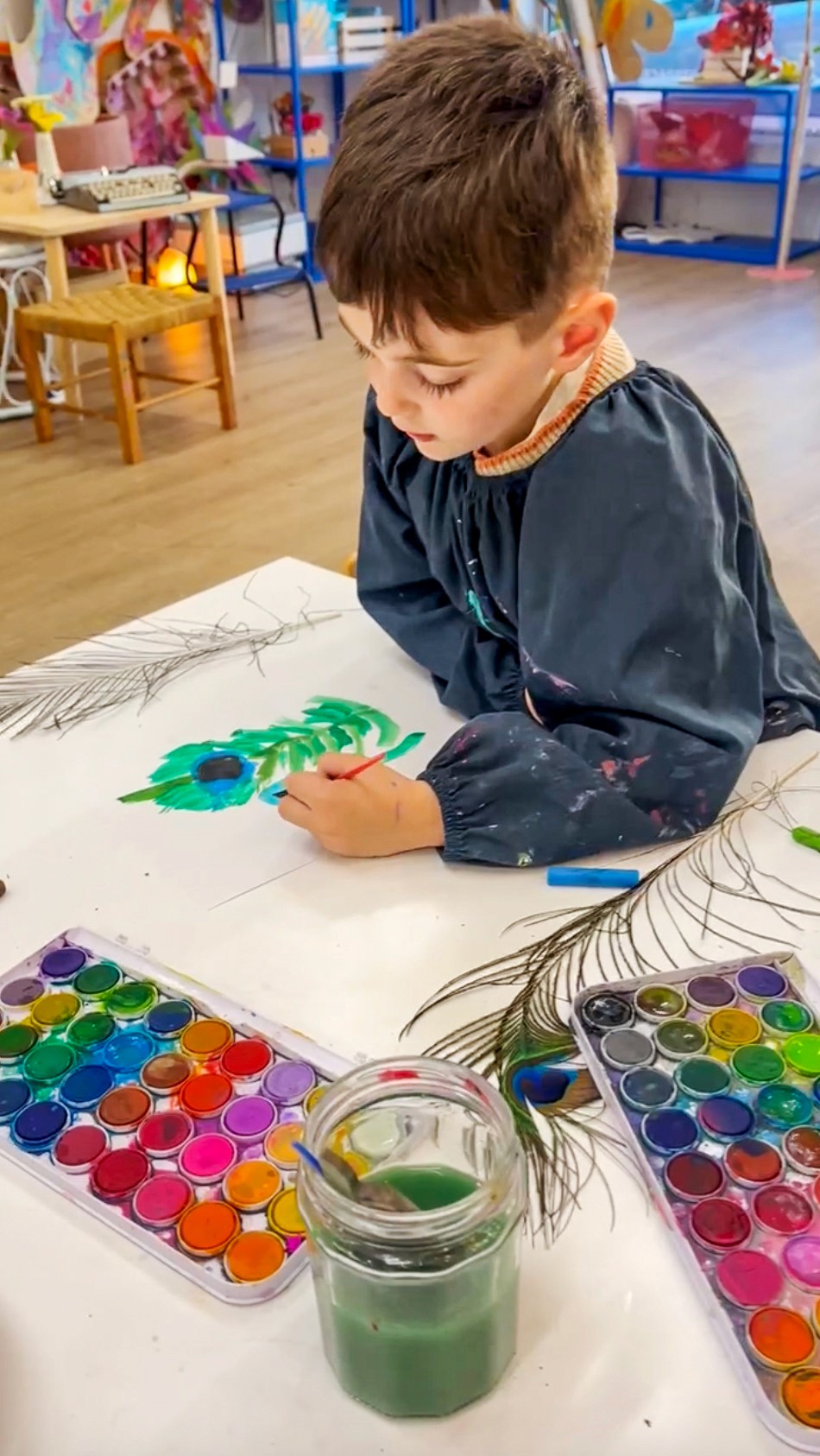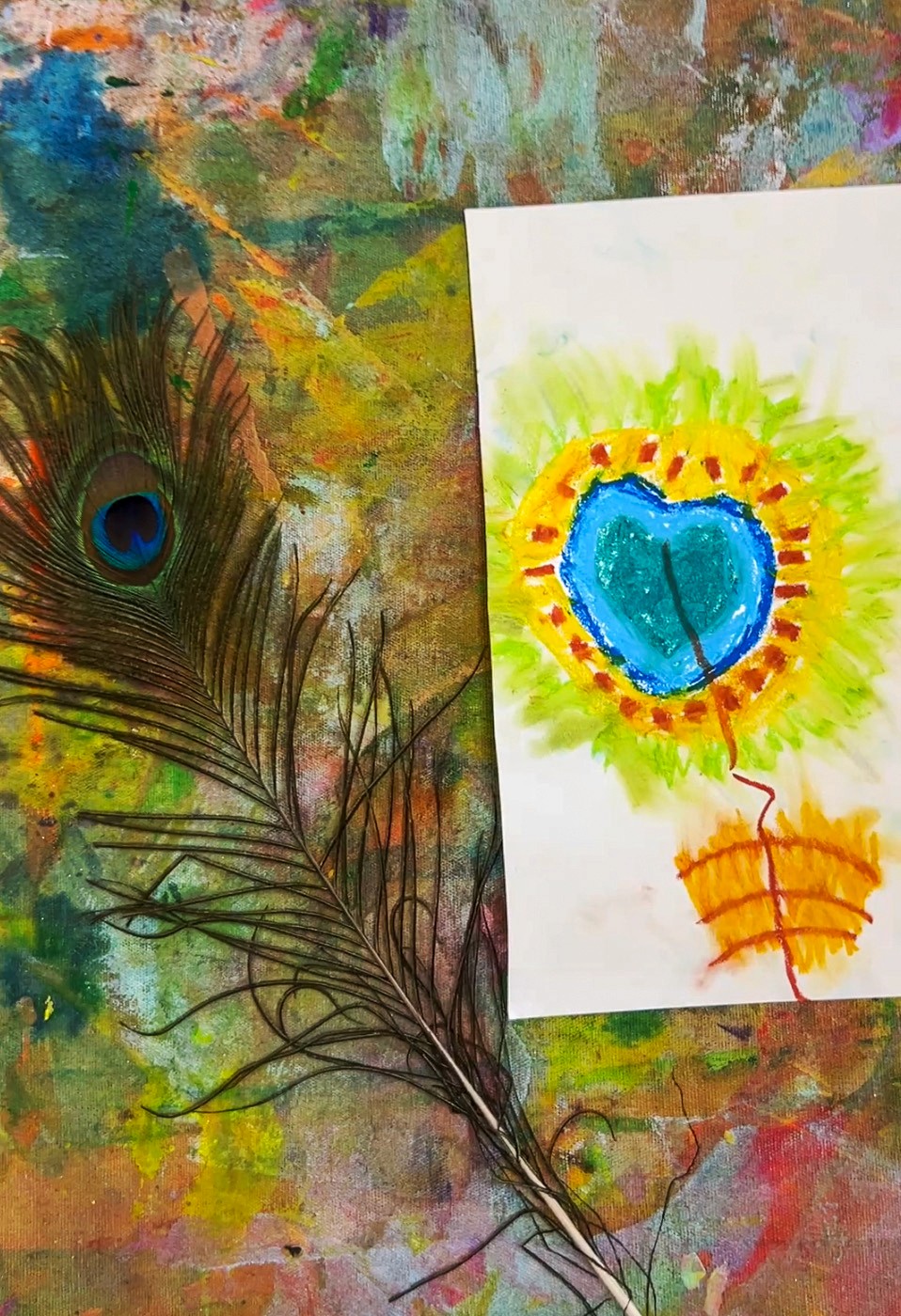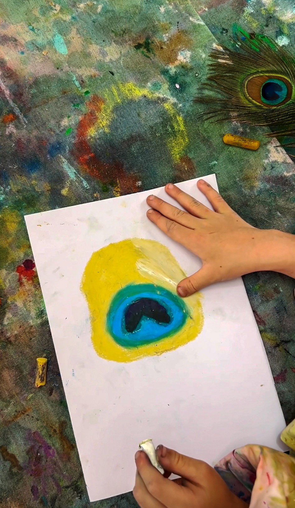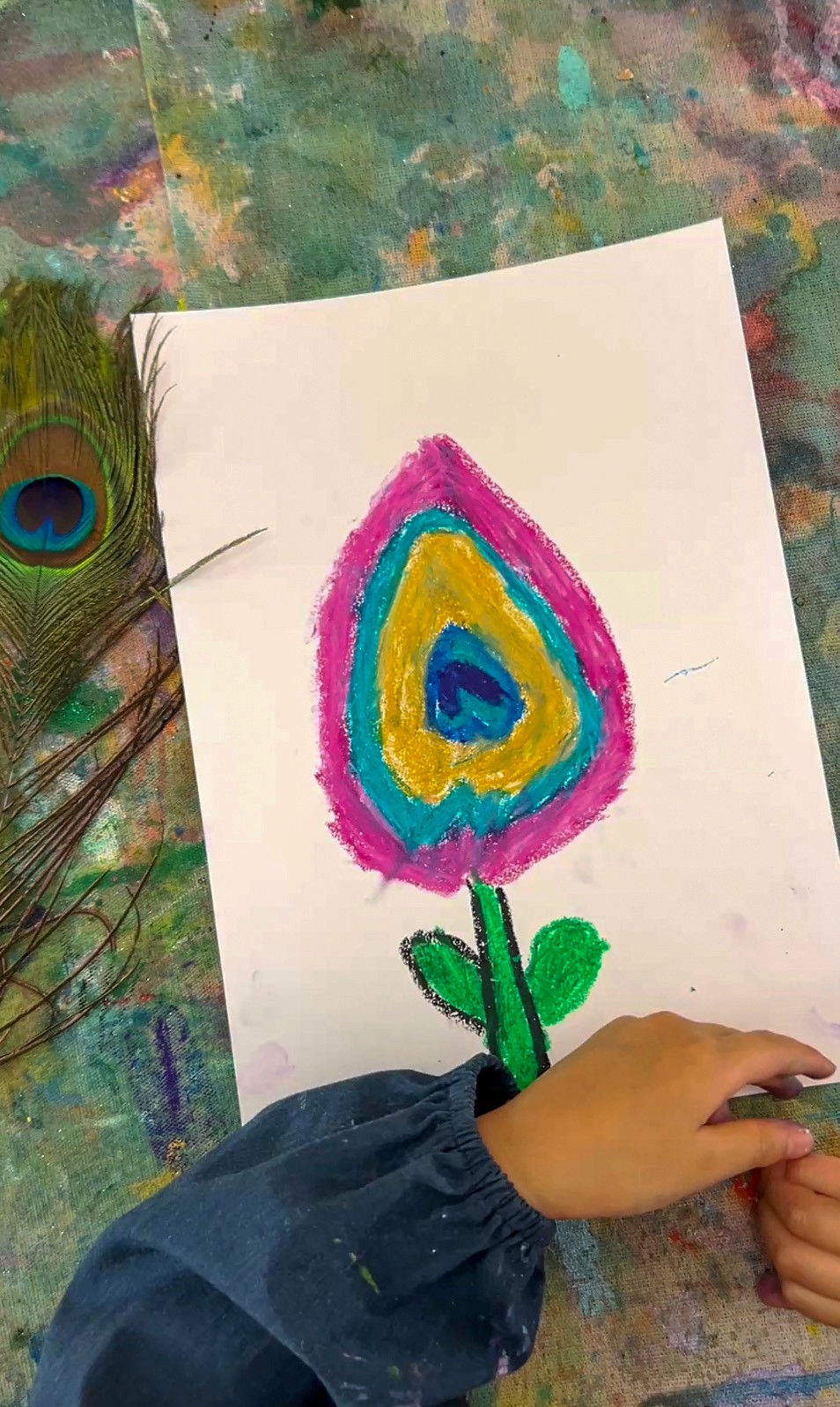 Place feathers in the centre of the table, a mix of peacock feathers and other interesting feathers if you have them. Set out oil pastels in curated colours (greens, blues, teals, golds) alongside watercolour palettes. We love offering long, thin paper for this activity to mimic the shape of the feathers themselves.