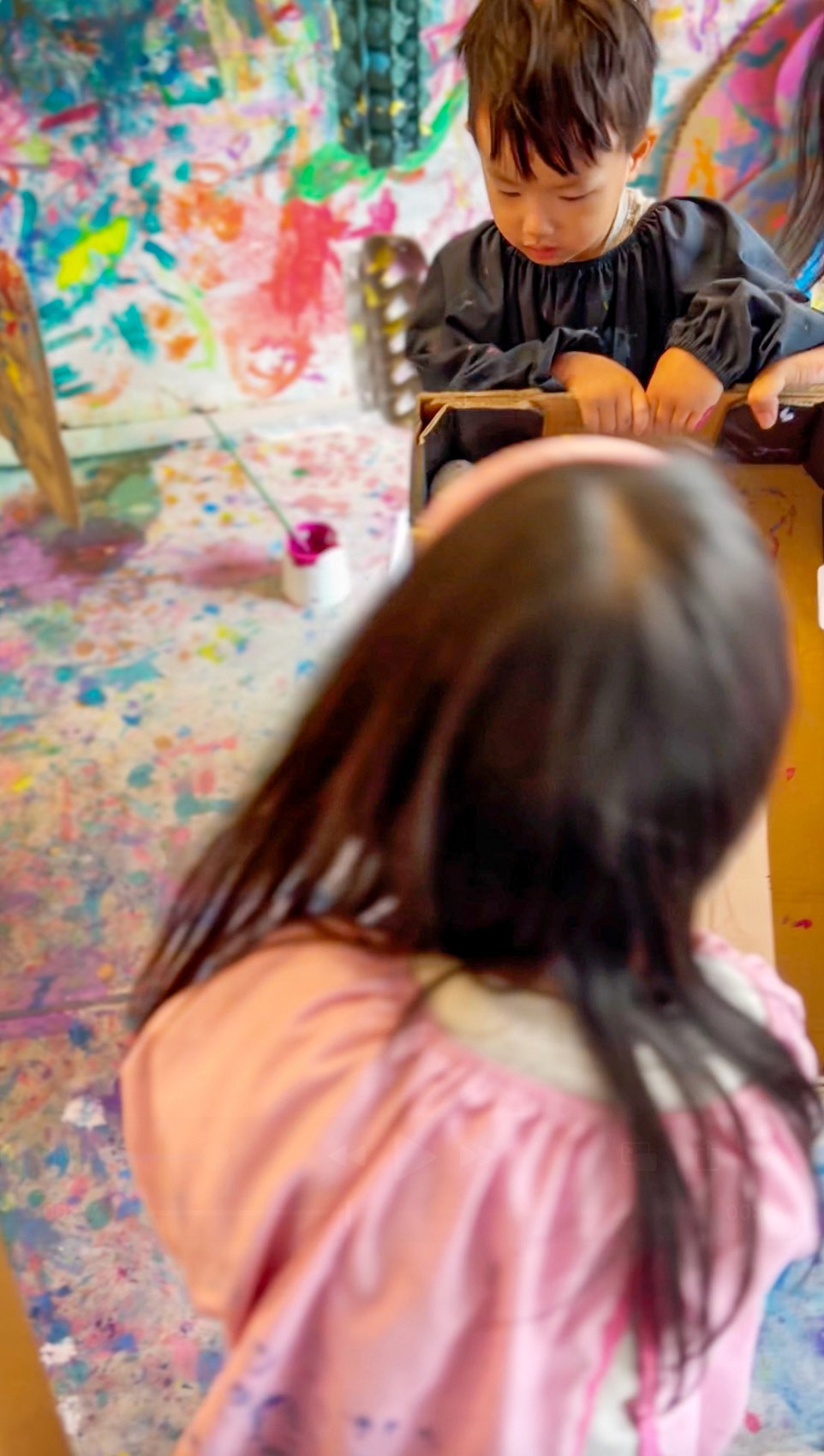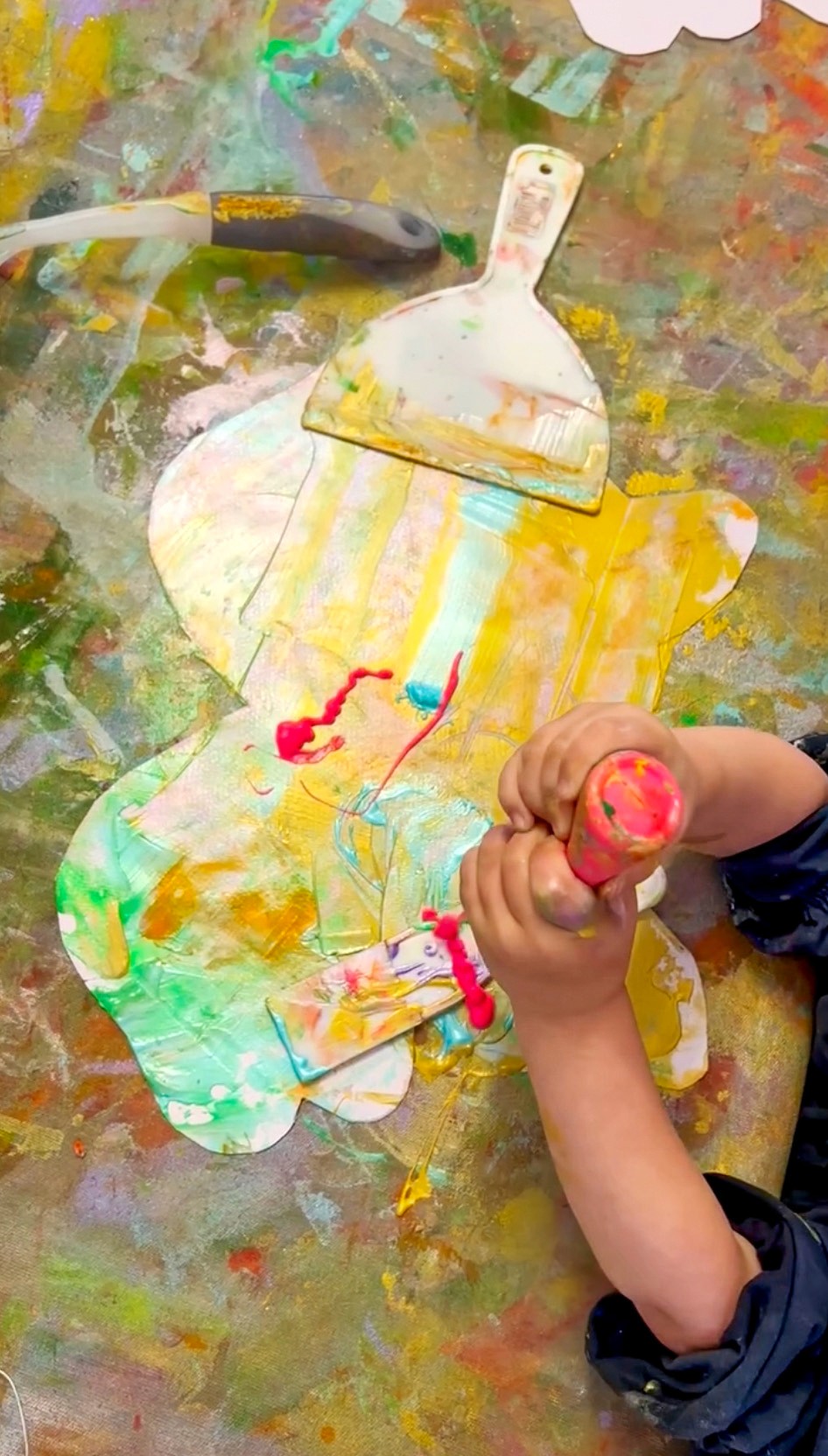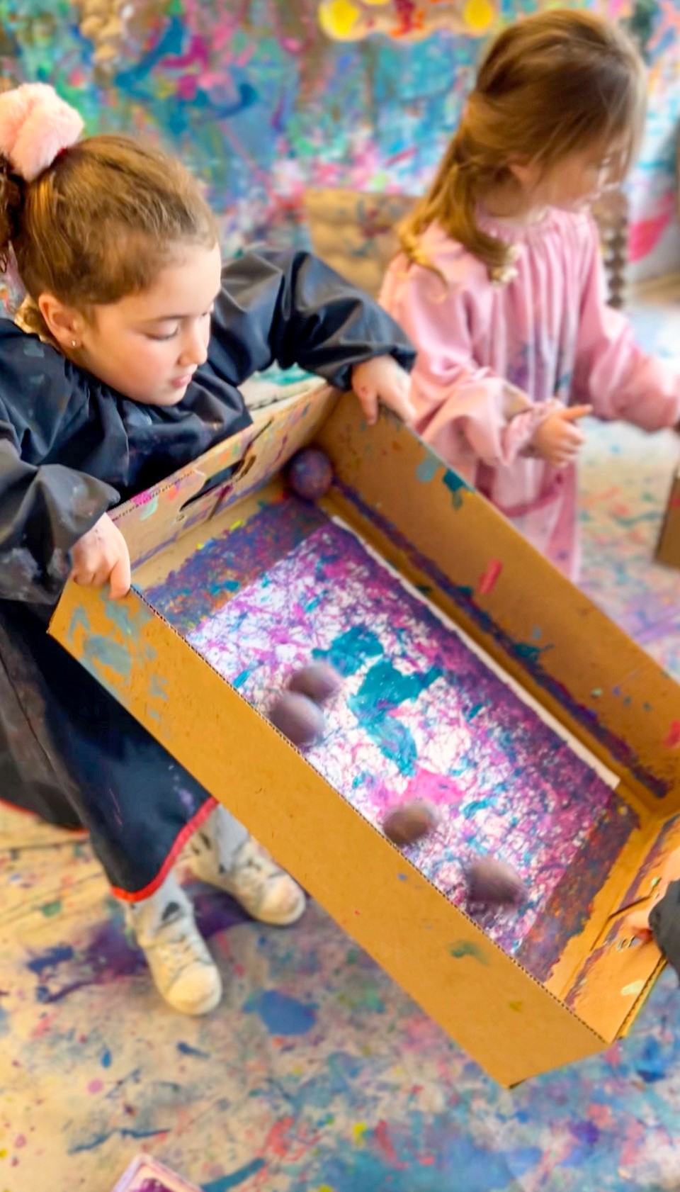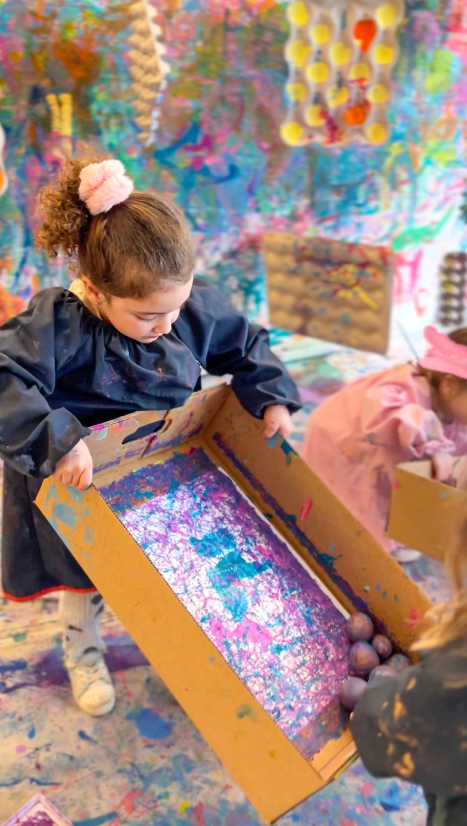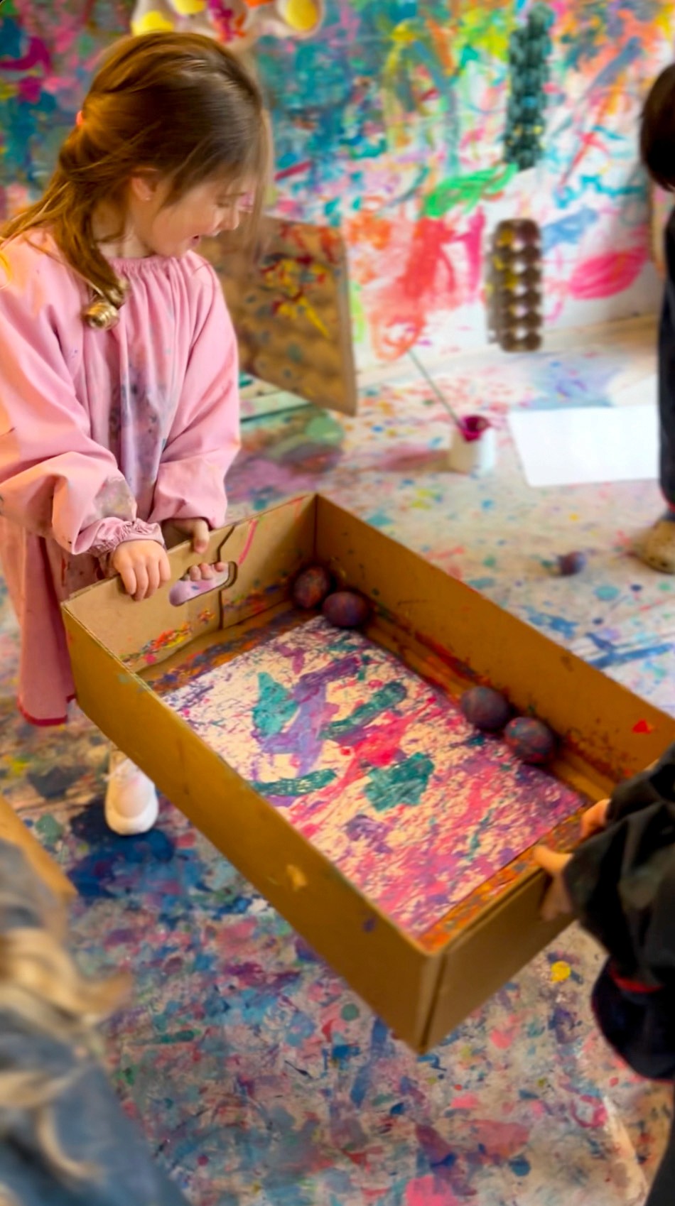Roll wooden eggs through rivers of paint in big, bold, beautiful chaos.