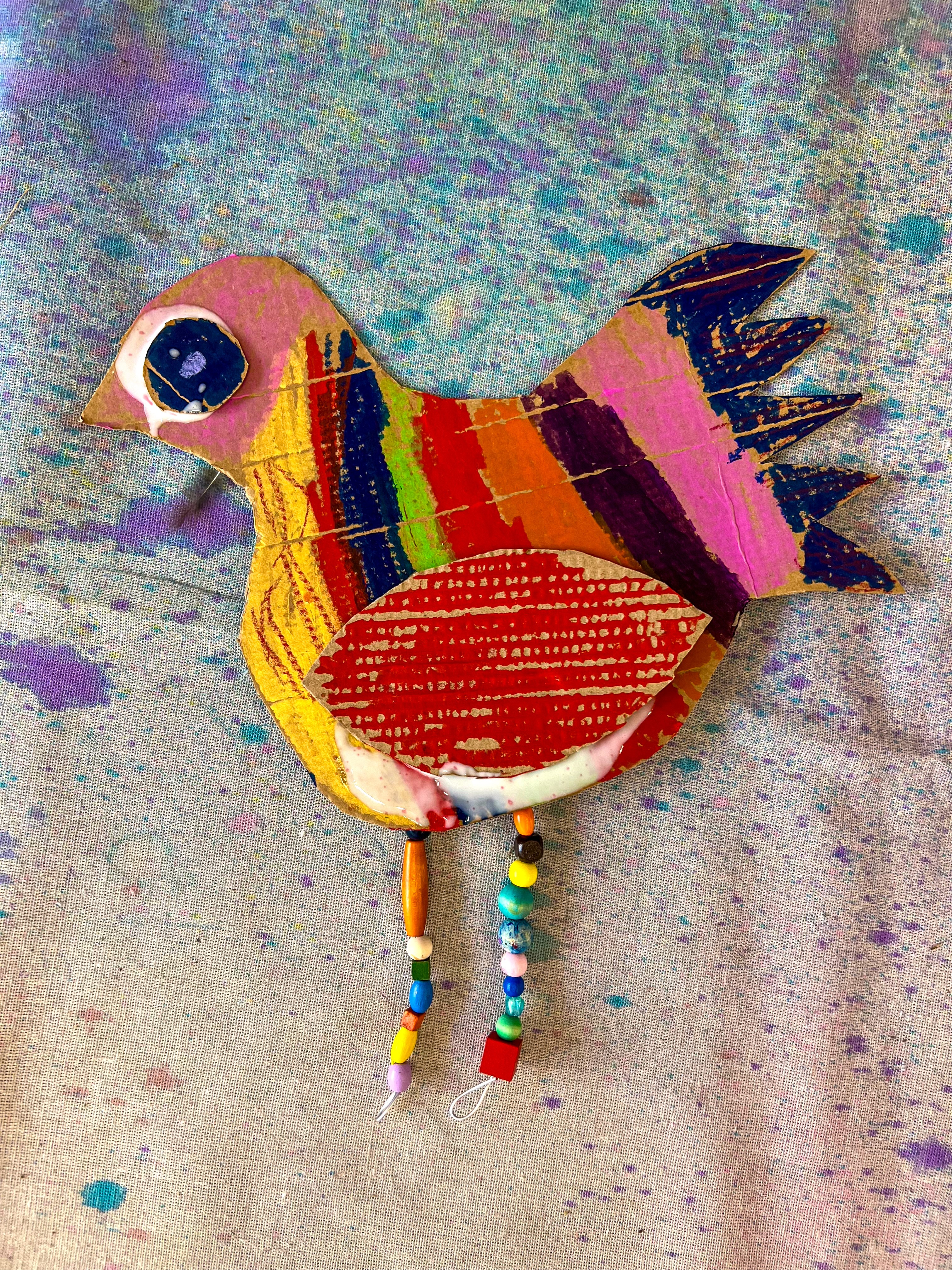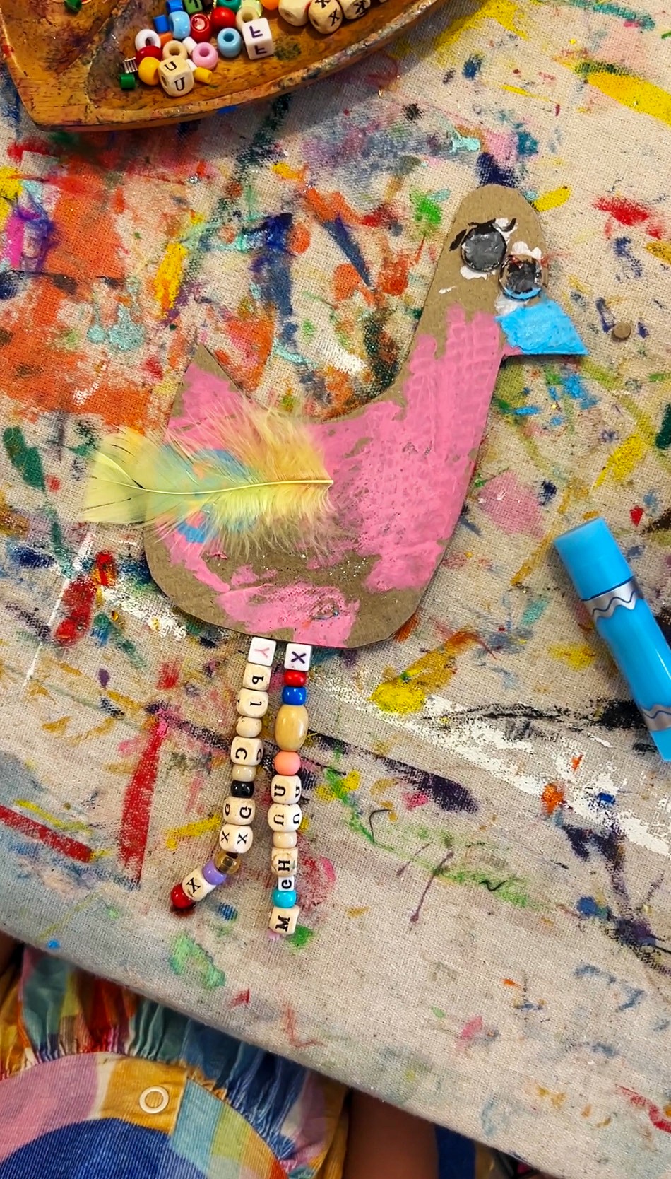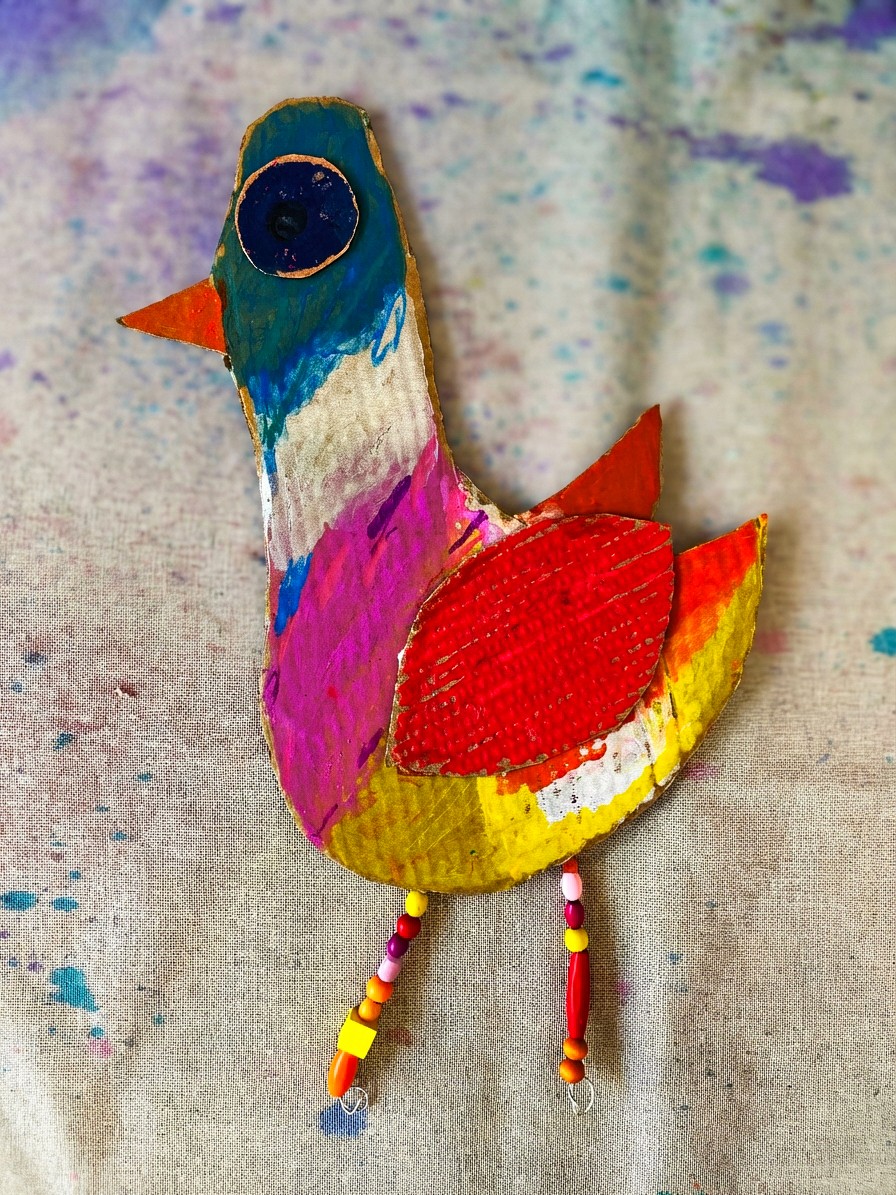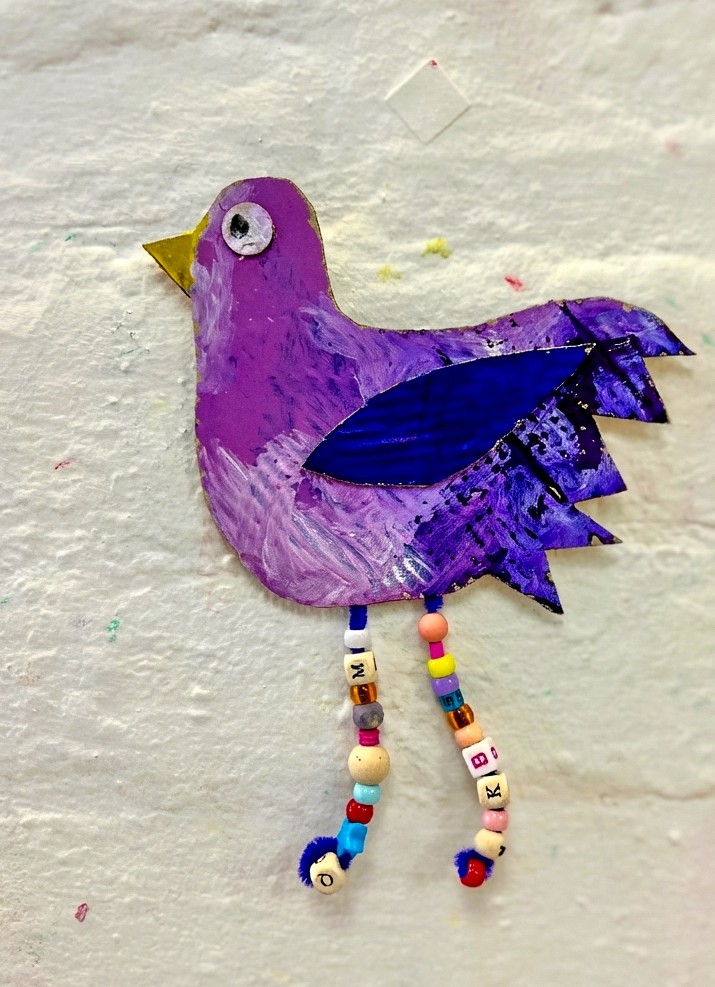 Artists choose a body shape, attach wings wherever they like (this is the fun bit... there's no right place), add eyes, and then decorate to their heart's content. Thread beads onto the pipe cleaner legs before bending the end into a little foot shape. They dangle beautifully and add so much character. If you want the birds to stand, fold the cardboard at the base to create a little stand, or prop them up with a blob of play dough.