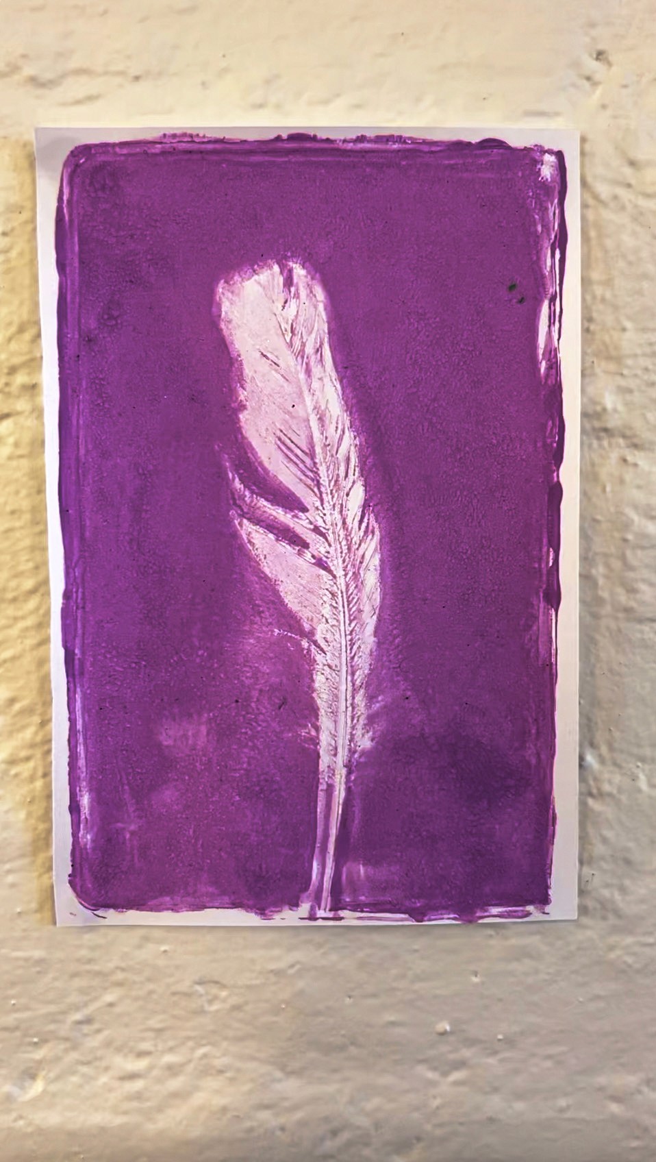 Now lay feathers onto the painted surface, gently press them down, and place your cardstock on top. Smooth it over with your hands, then peel. The feathers leave the most beautiful negative-space impressions, delicate, detailed, and completely unique every time!