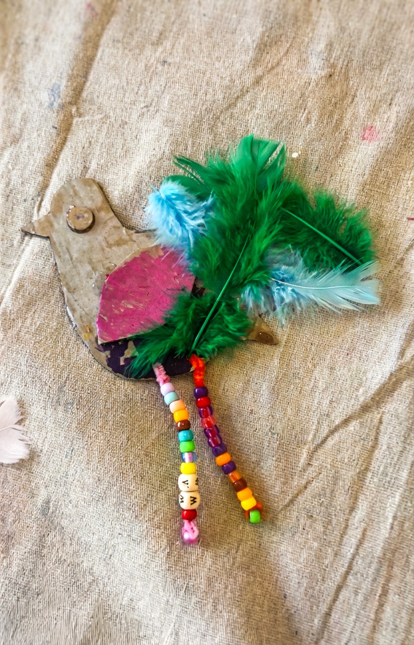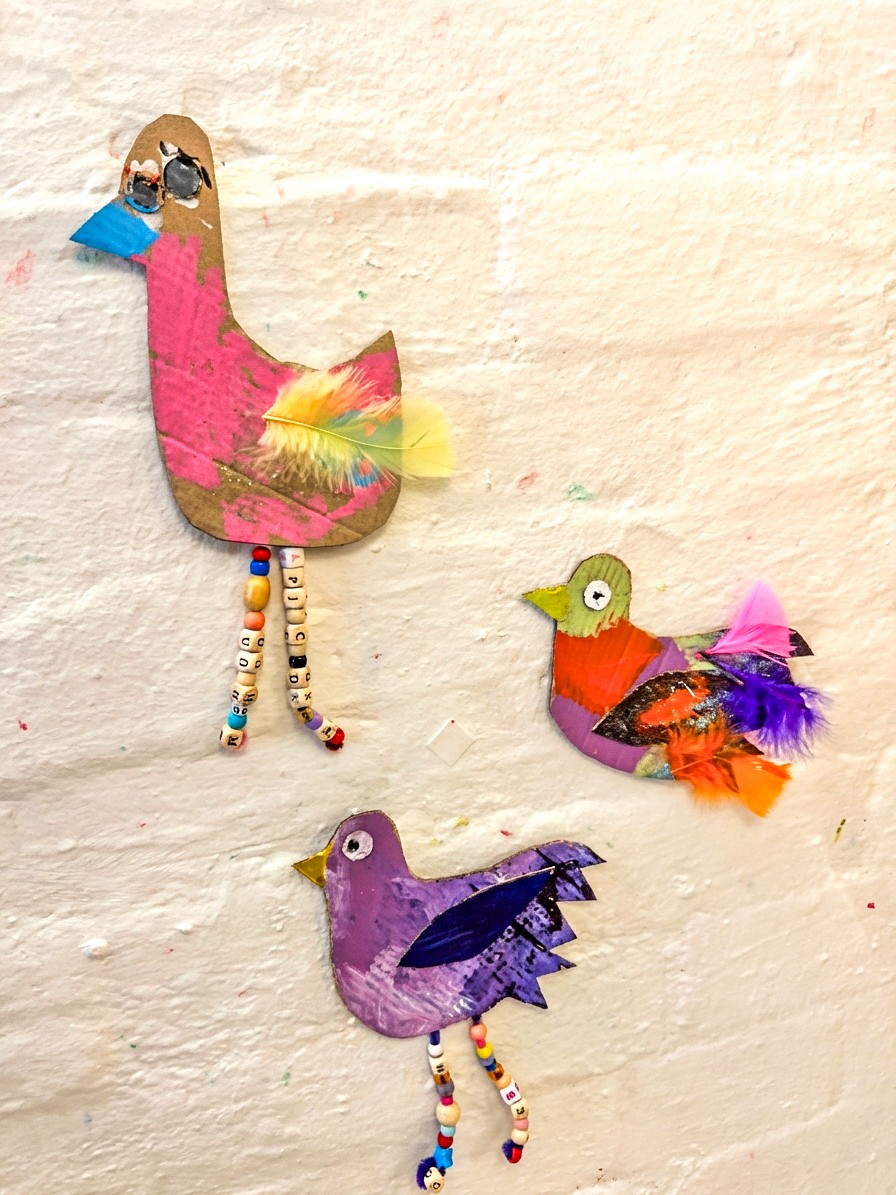 Set out paint, brushes, and collage materials and let artists go to town on their cardboard birds and feathers. Big, bold brush strokes work beautifully because the pieces are large enough to really get into.