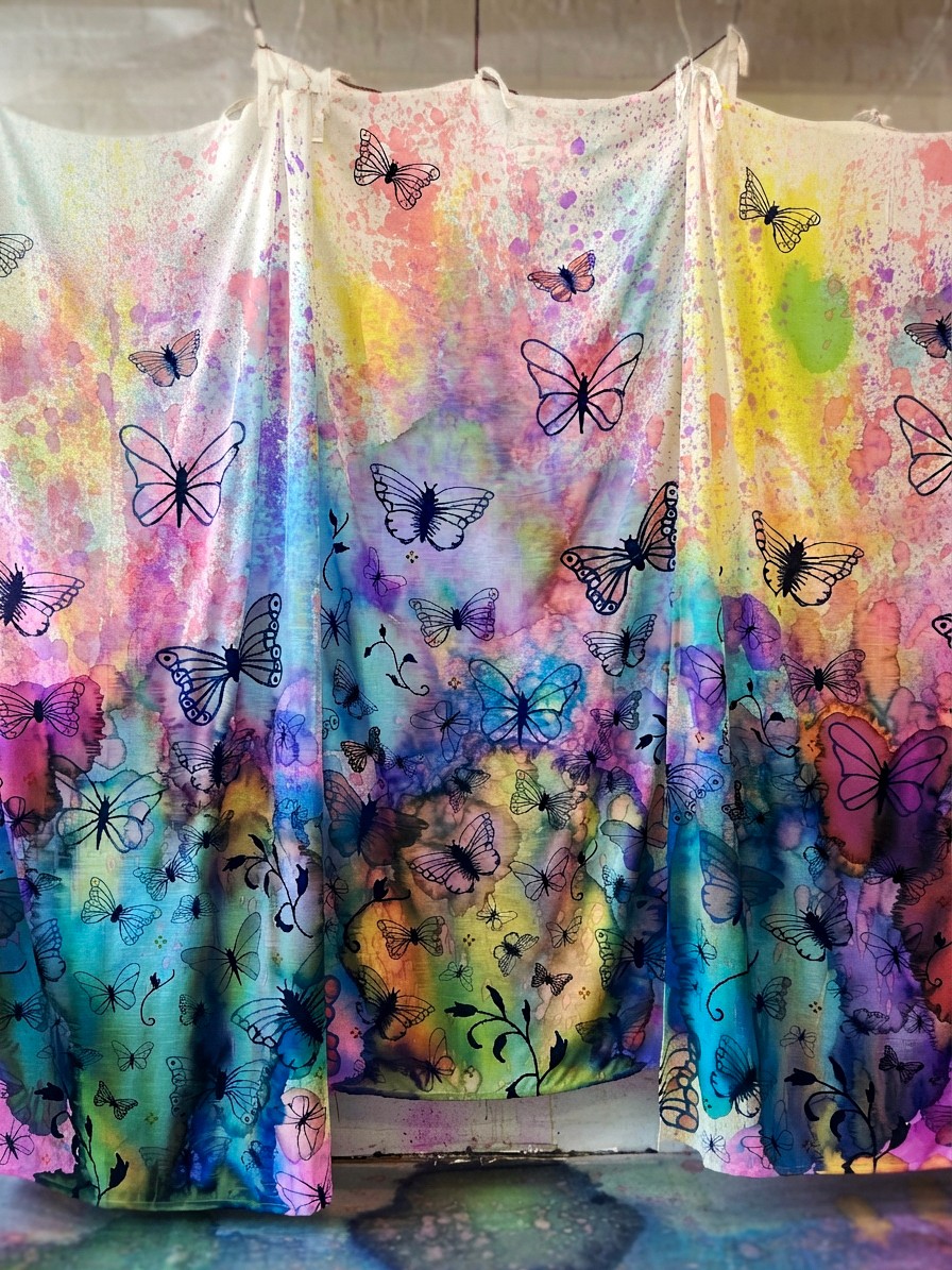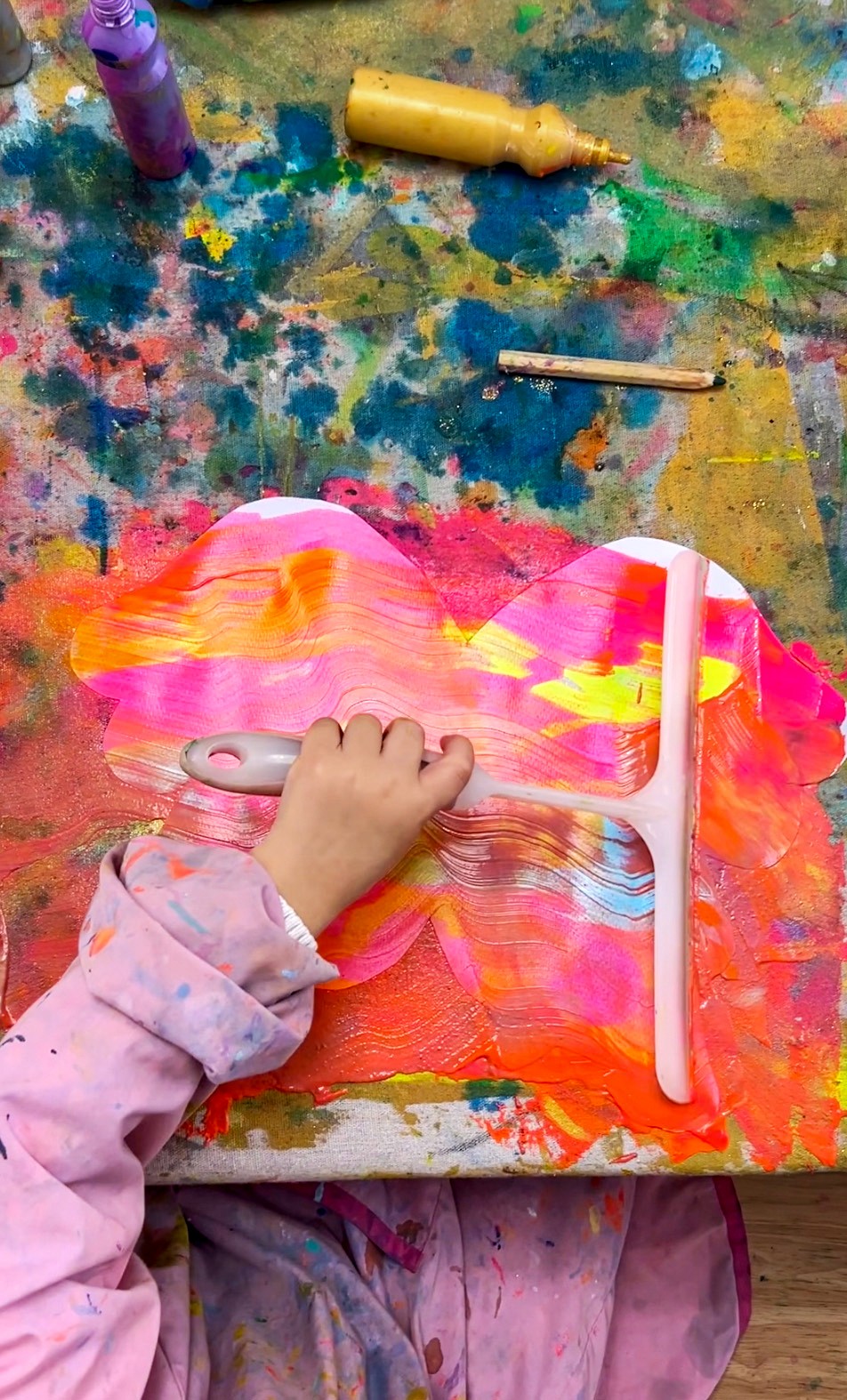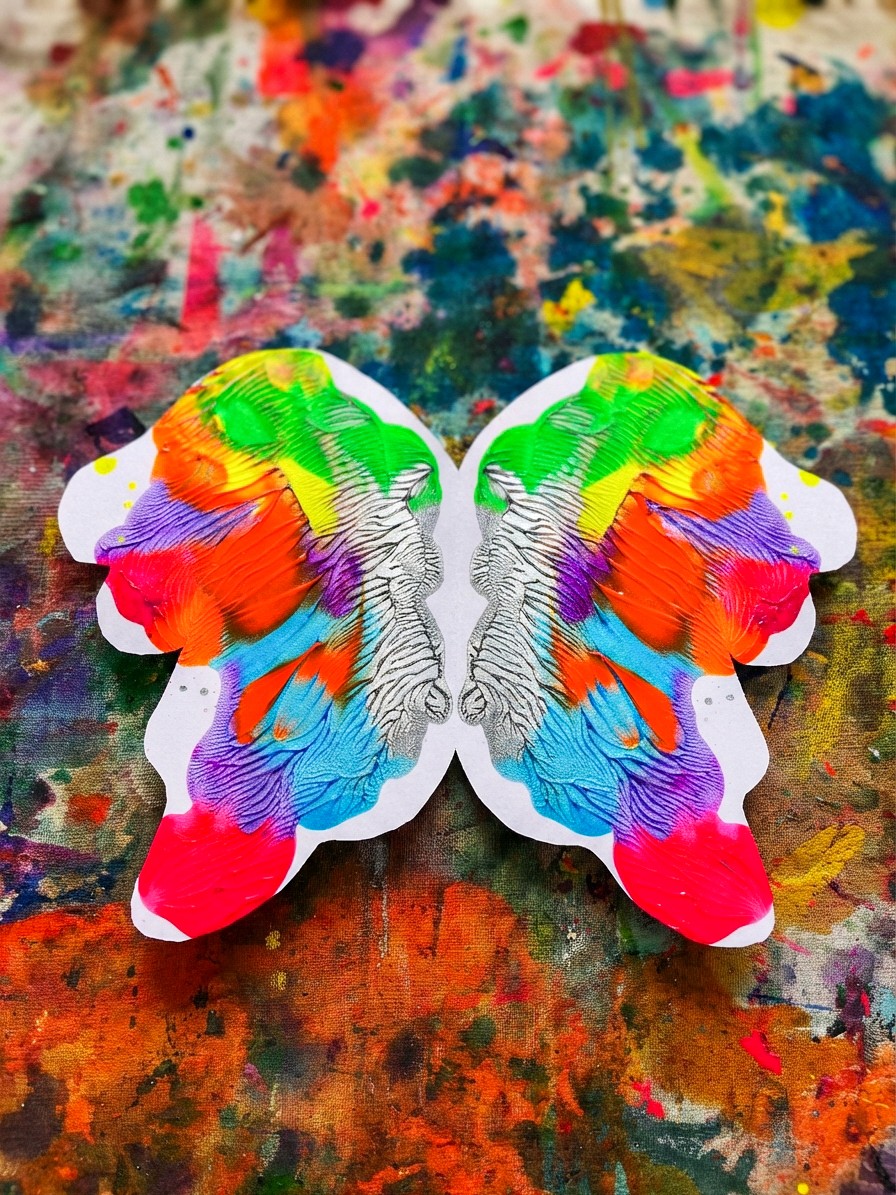 Artists squeeze lines, blobs, and squiggles of paint onto their butterfly wing shape, then drag a scraper or old business card across the surface to spread and blend the colours. The colours mix and merge as the scraper moves, creating these incredible streaks and gradients that are different every single time.