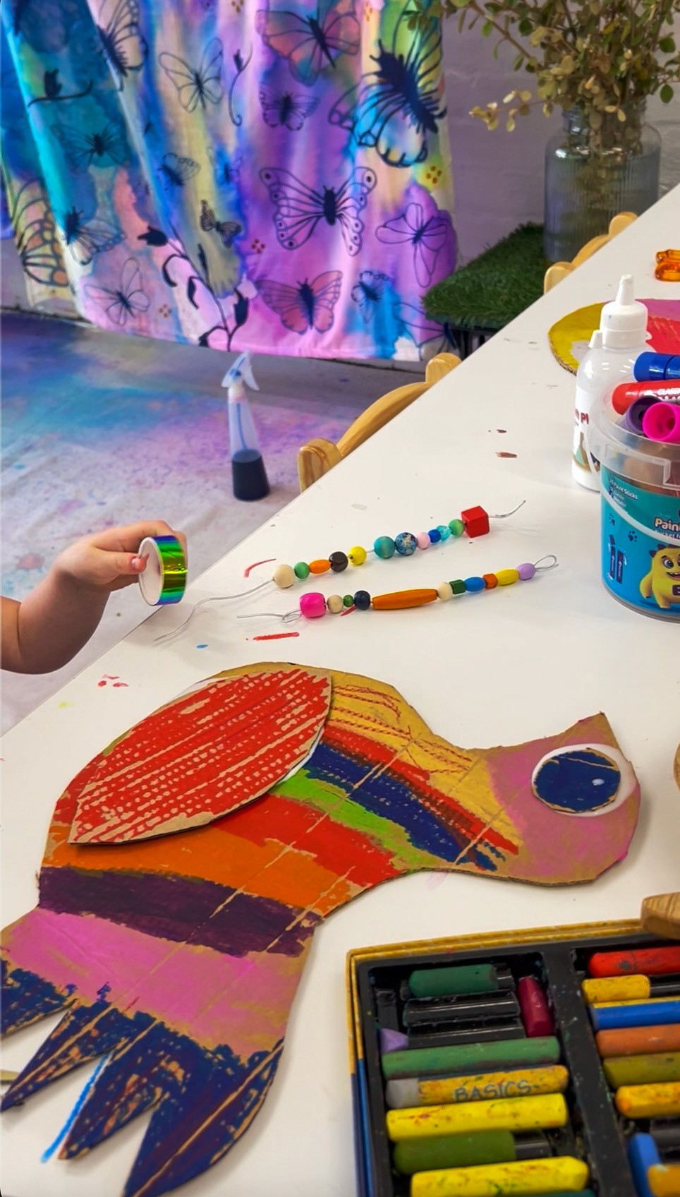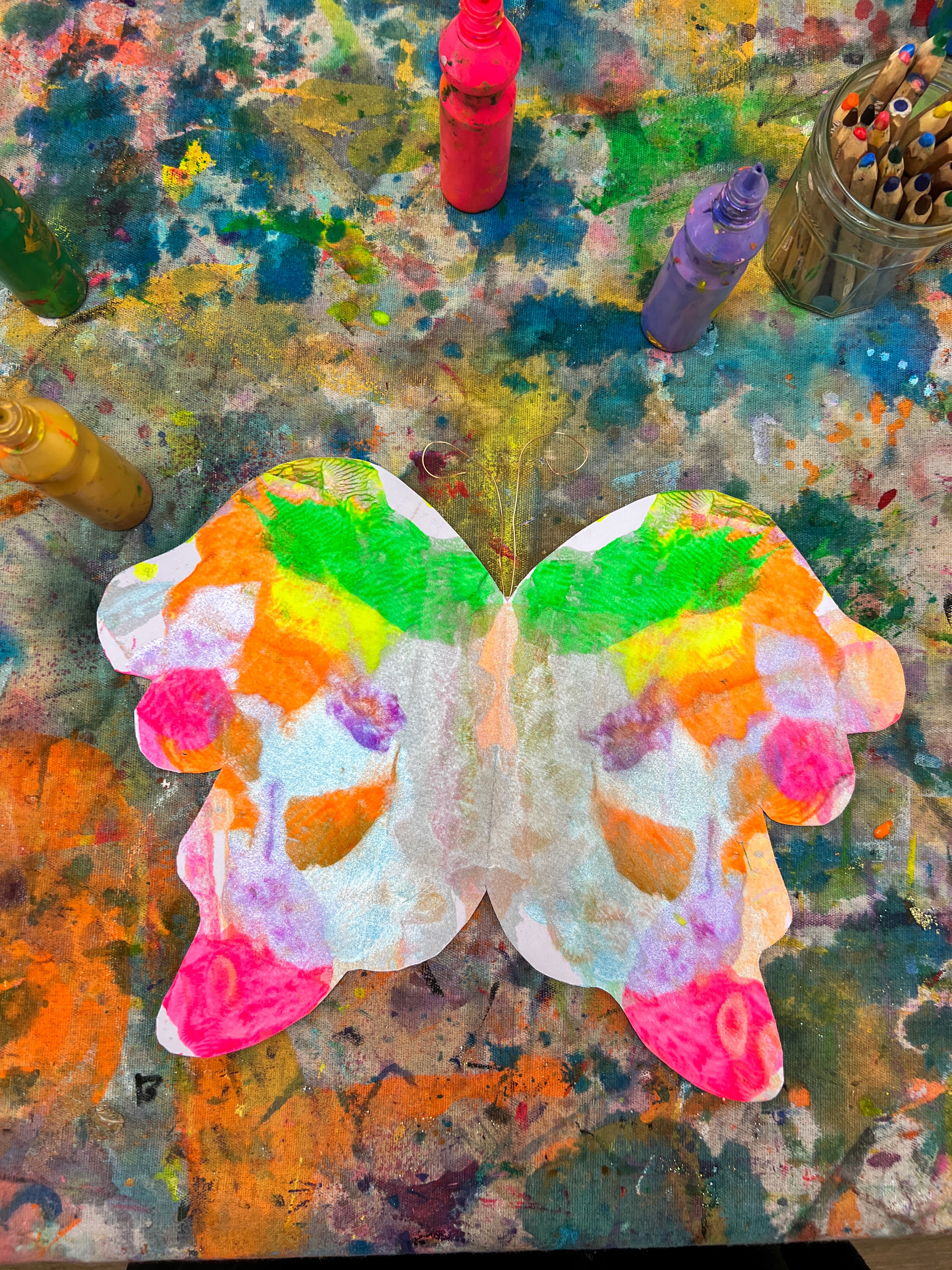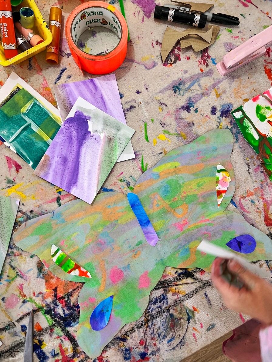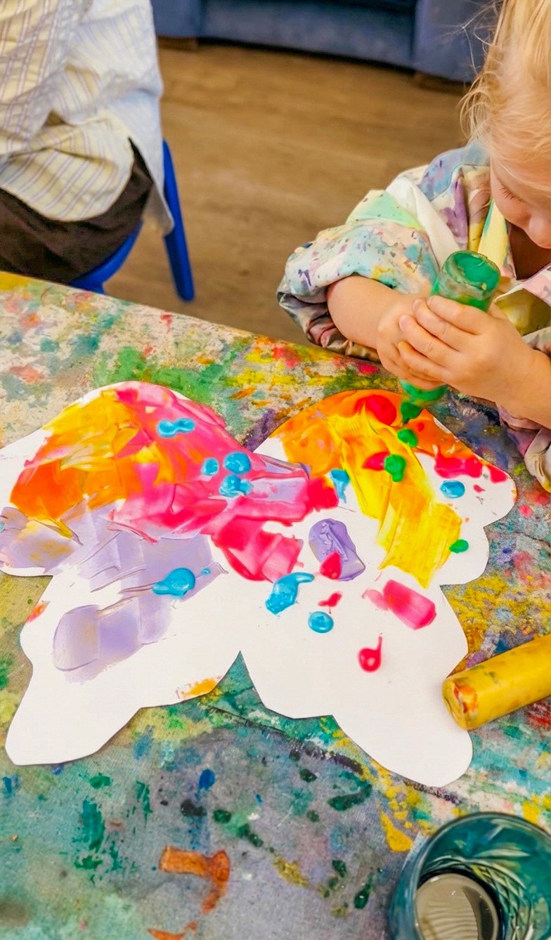 Paint scraping is a process that kids (and adults) absolutely love because it feels like you're breaking the rules a little. Instead of carefully painting with a brush, you're squeezing and scraping. Paired with butterfly wing shapes, the results are stunning; big, bold, bright, and incredibly satisfying!