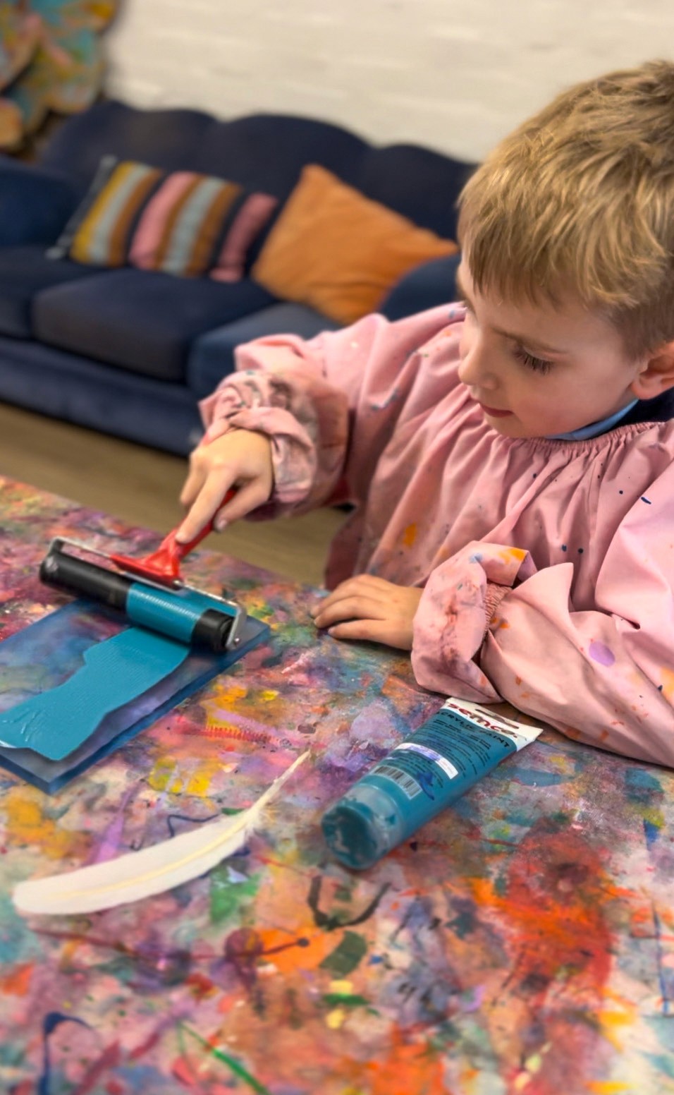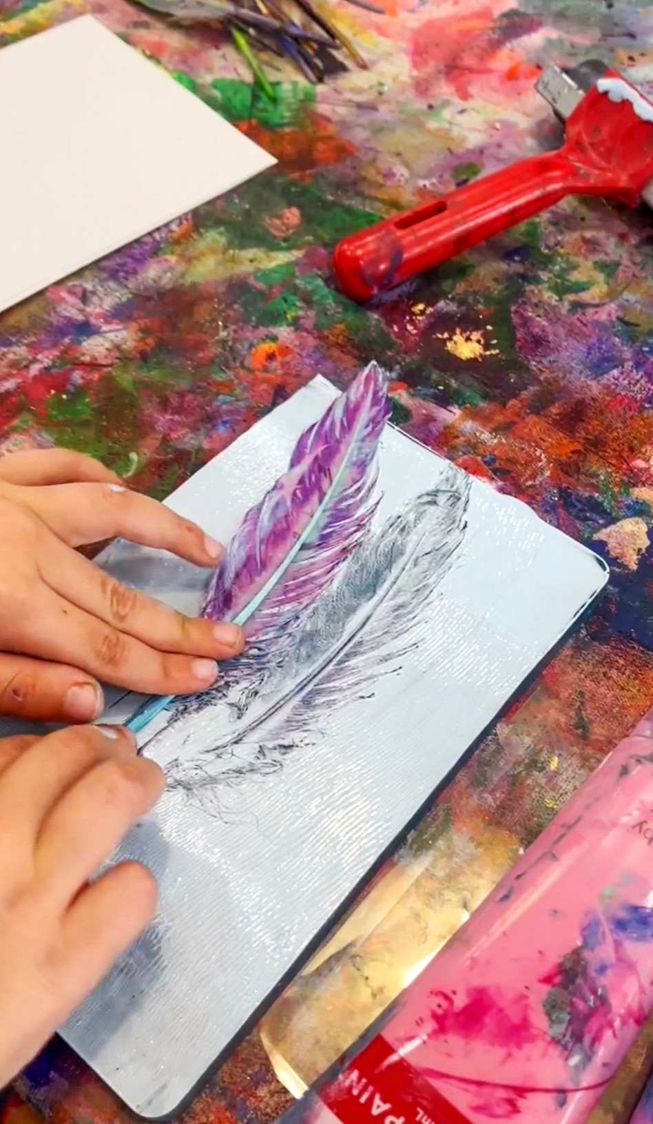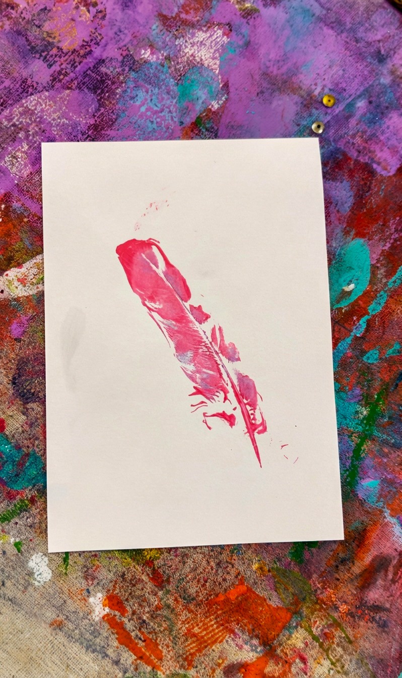 Layer multiple prints on the same piece of paper for a rich, textured result. You can also try pressing leaves, lace, or bubble wrap alongside the feathers for different textures and patterns. For a first go, start with just one colour and feathers to keep it simple, then build up to more complex layers as confidence grows. Although as we know, kids have the most incredibly creative minds, so just letting them go for it in the beginning is my forever favourite!