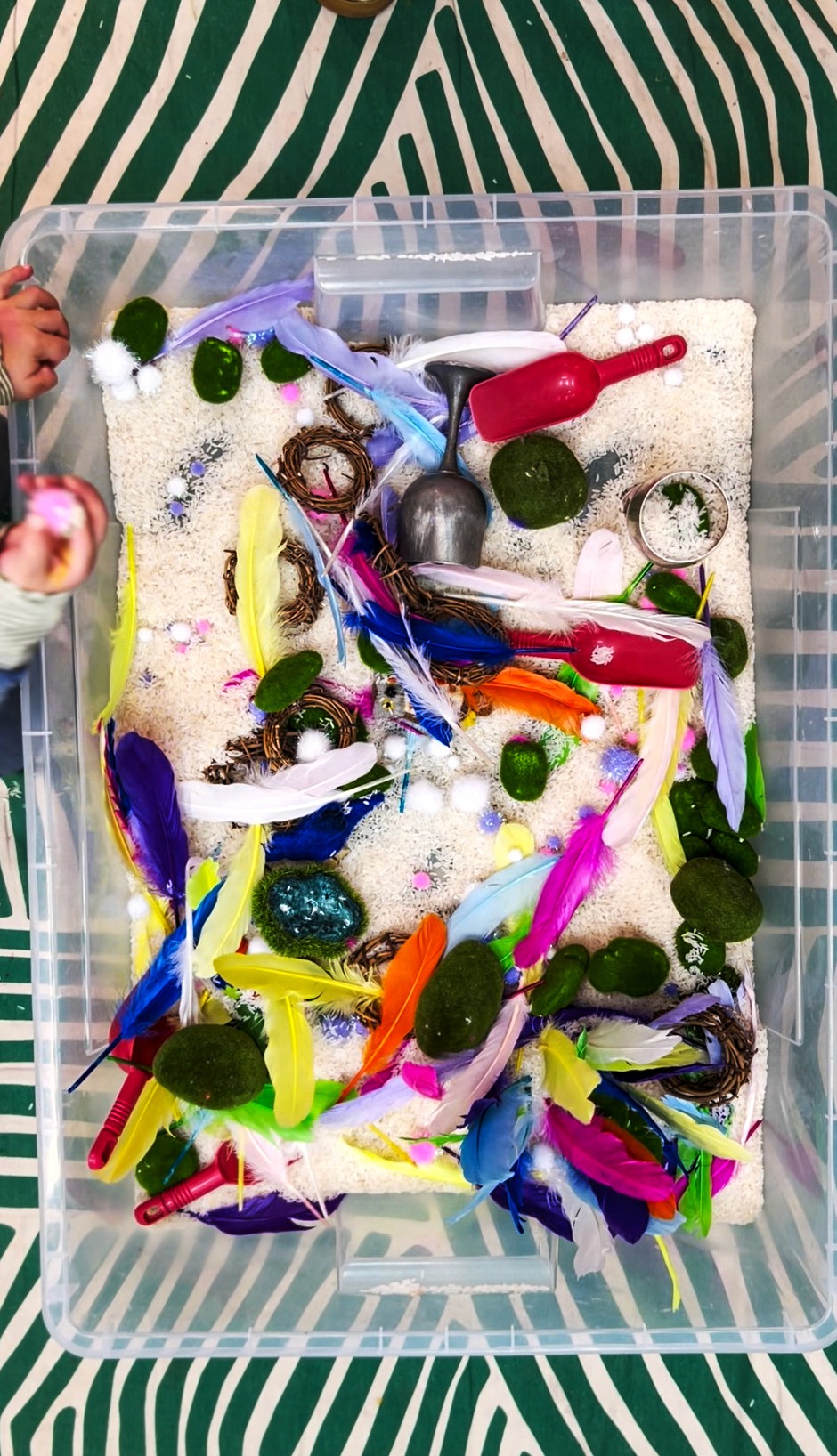 Start with a base of white rice in a large tray or tub. Layer in colourful feathers, wooden eggs, little twine nests, pom poms and birds toys (or anything with wings!). At Smudge, I've curated a collection of felt birds and dragons from Tara's Treasures; they're the most incredible brand from Melbourne and support women in Nepal with their craft... we absolutely love them. IKEA also has the cutest little fluffy bees.