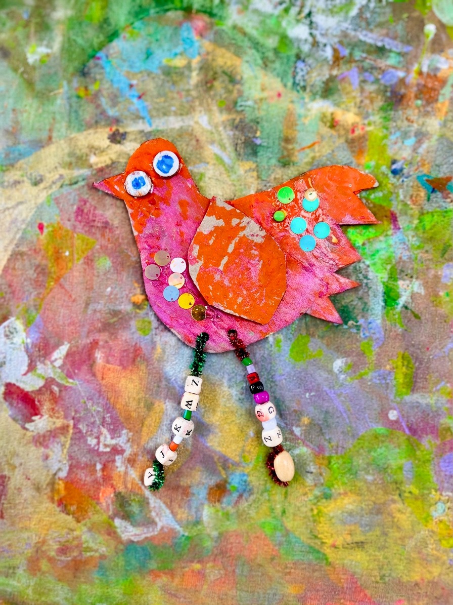 Pre-cut a selection of bird body shapes in different sizes, along with separate wing pieces and circles for eyes. Lay these out so artists can mix and match. Curate pipe cleaners and beads for creating dangling legs, paper straws for extra structural details, and any kind of collage material you like: feathers (of course!), tissue paper, fabric scraps, buttons, sequins.