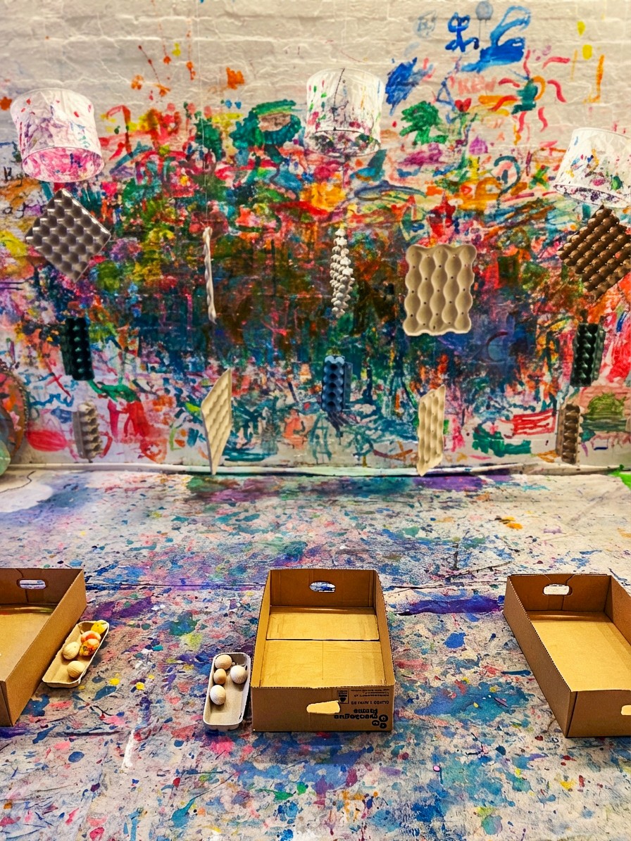 We use the big cardboard fruit boxes from our local greengrocer. They have nice high sides that keep things (mostly) contained. Pop an A3 sheet of paper in the bottom, and offer wooden eggs for rolling. You could use any egg or ball shape, just make sure it's heavier than a ping pong ball…those just get stuck in the paint and don't really roll.