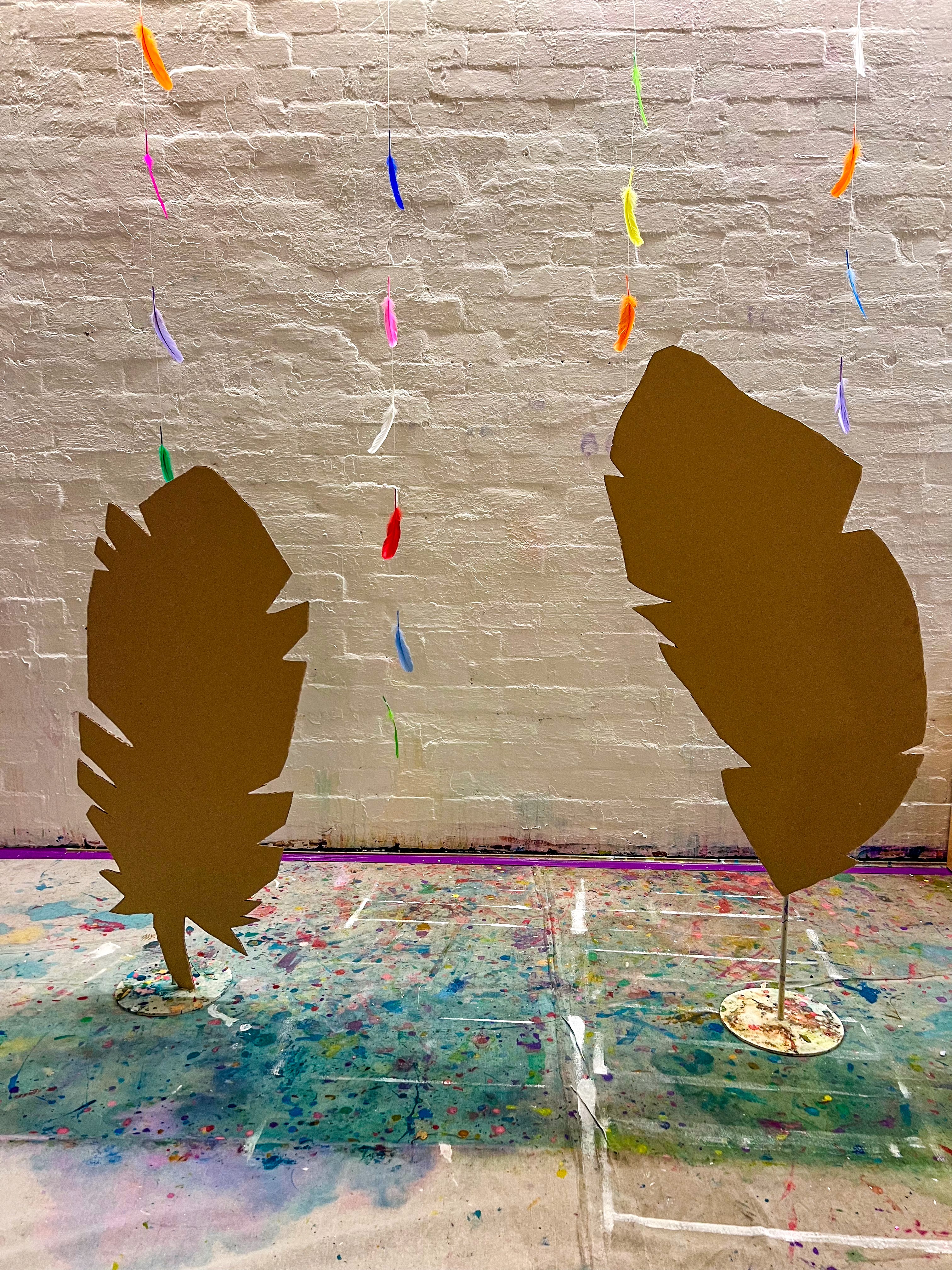 Start by cutting out giant bird shapes from large sheets of cardboard. Don't worry about getting them perfect... wonky wings and oversized beaks are part of the charm. You're building an aviary, and aviaries are meant to be big, layered, and full of life! You'll also want to cut some giant feather shapes to hang alongside the birds. At Smudge, we use metal stands and fishing line to hang the pieces, but you could drape them from a clothesline, tape them to a wall, or string them between two chairs. Whatever works in your space.