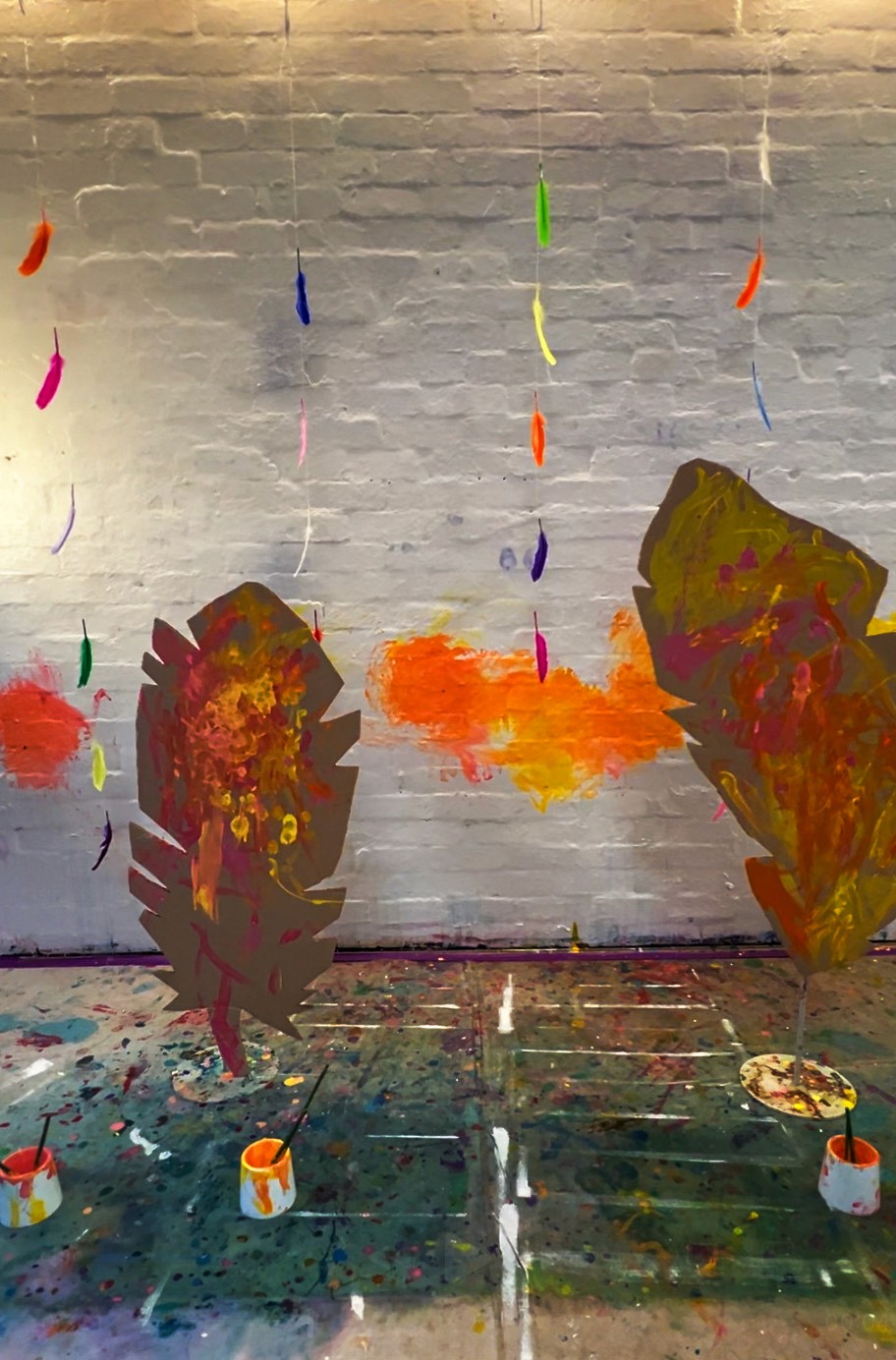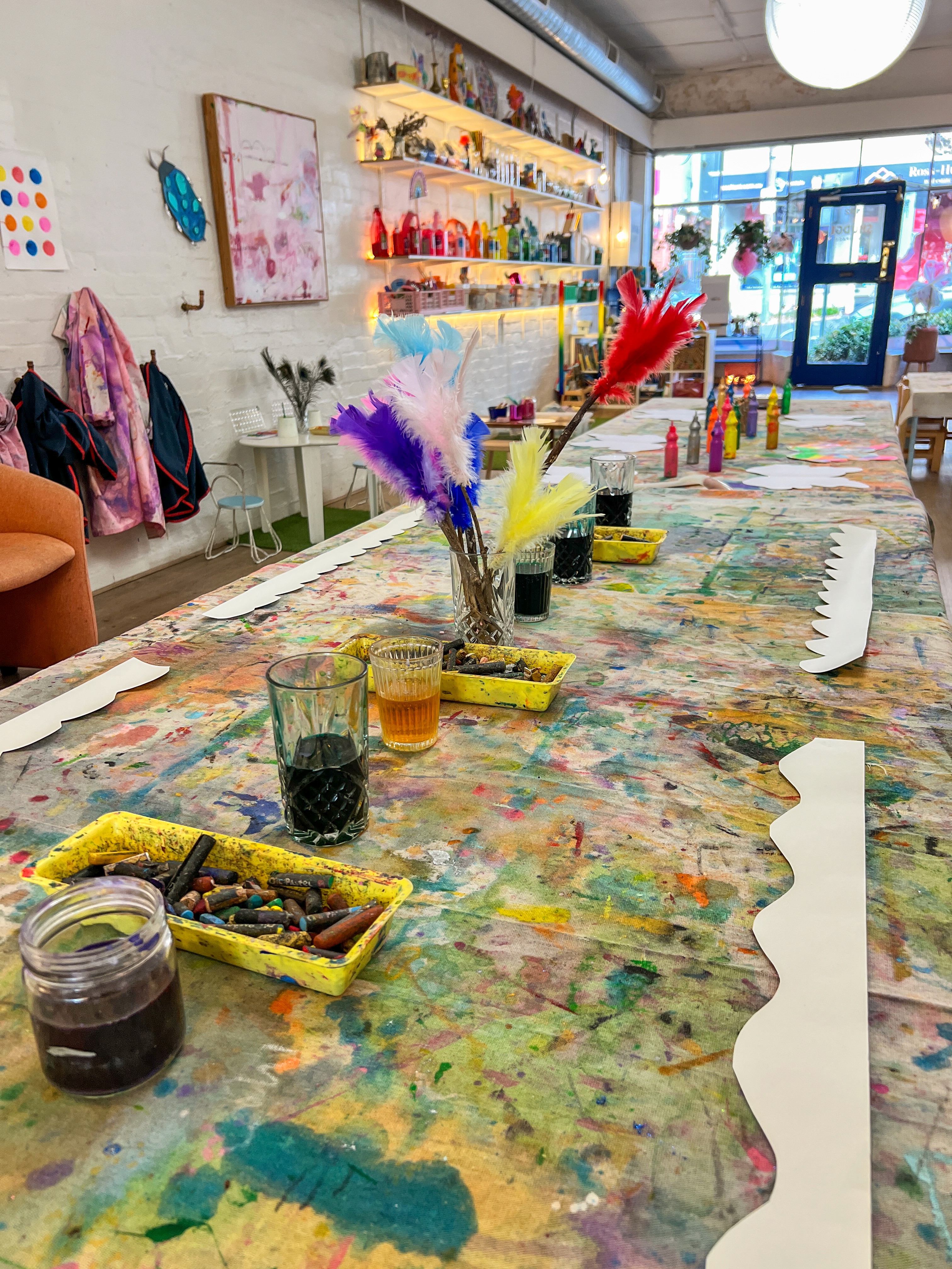 Set out paint brushes and jars of paint so artists can plop colour onto the page.